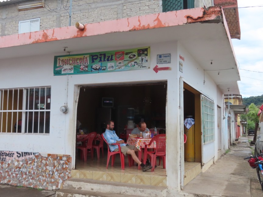 We left our bags with the smiling lady who seemed a bit bemused by us three soggy gringos then we went into town to find some breakfast. We ended up at a little corner cafe on the main street. The town was slowly coming out from hiding from the rain and we had a front row view of the locals going about their business.