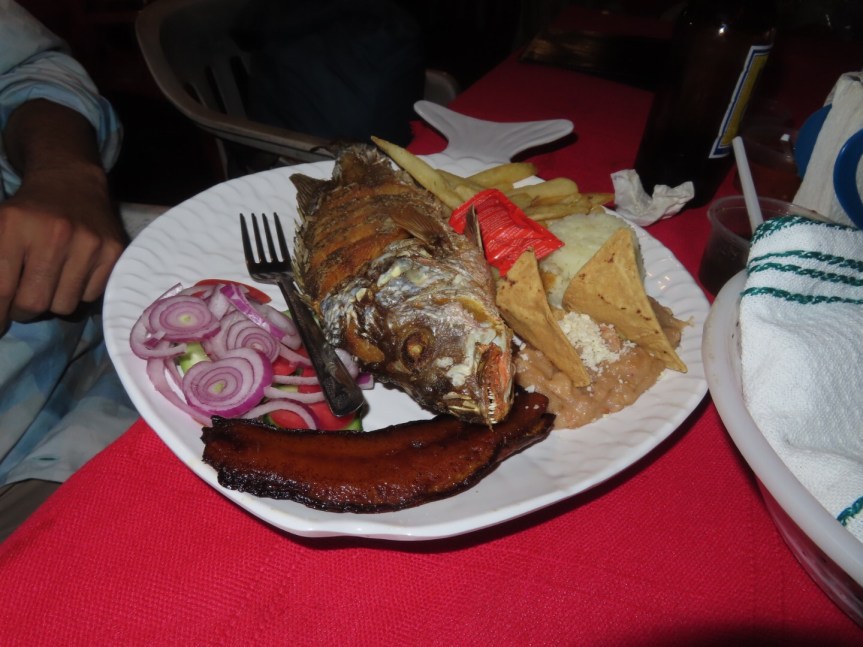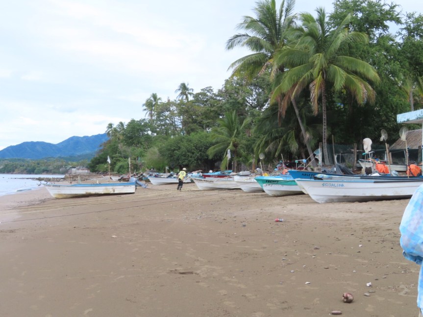 The waves at the point were tiny but you could see their potential. Lefts were rolling into the bay while a few locals threw hand lines into the waves while their family looked on from hammocks under a palapa. We decided to walk back along the rocky shore which may or may not have been our greatest choice while toting bicycles. We wandered into the swamp for a while to escape the rising tide but soon were back at the main beach with its line of mariscos restaurants and fishermen tending their boats.