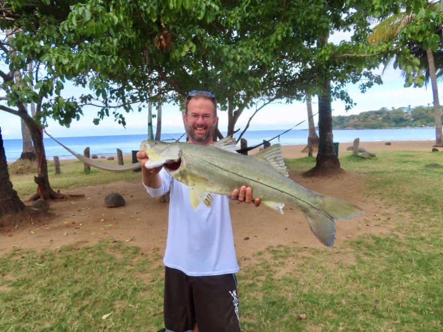 I was up early sitting out in my chair sipping a cup of tea when Alan came strolling up the beach from the north carrying a big ol’ robalo. Wow, it must have weighed close to twenty pounds. I loaned him my cutting board and a knife. He soon had a pair of old timers looking over his shoulder telling him how to go about filleting it, so I went back to my chair and finished uploading my post for the day. Schools of bait fish were being hit by jacks right out front. Flocks of pelicans and frigates were diving and whirling in a frenzy. Stoked about fishing, I grabbed my pole and chased the schools up and down the beach, but didn’t get a bite.