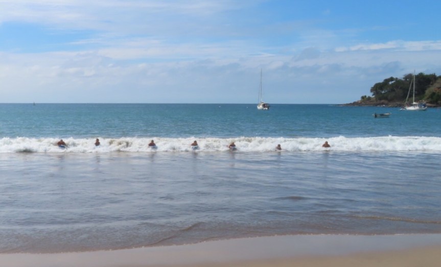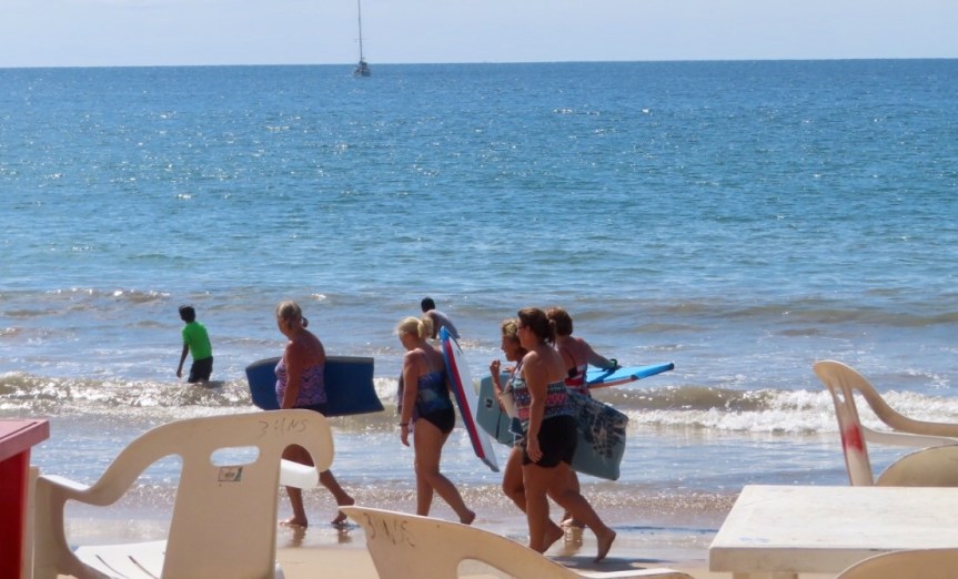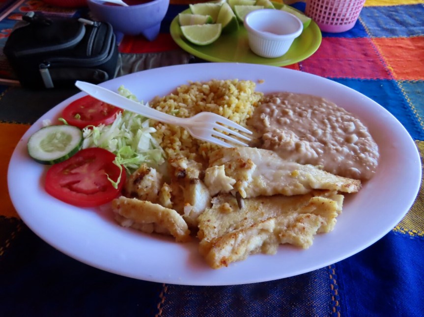 At lunch time, we took a couple of filets over to the palapa restaurant and they cooked it up for us and served it with rice, beans and salad. A mojo de Ajo, loaded with garlic and spices. The snook was excellent, a delicate white fish with firm filets. We relaxed in the shade watching the tourists hanging out at the beach.