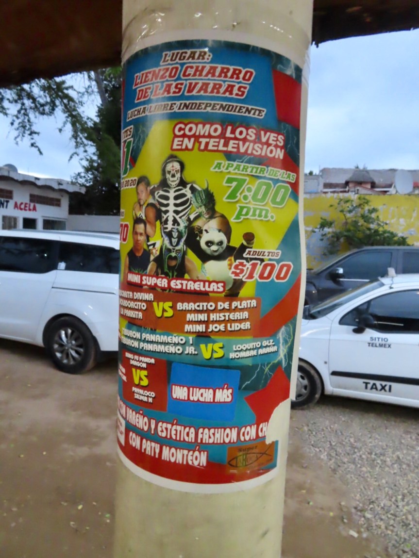 A troop of seniors with boogie boards went walking past to try their luck in the popping little shorebreak. Grays on trays, as they are known in Lo de Marcos. They seemed to having a great time sharing waves along the beach. More reading and lounging were in the works until the evening rolled around. We had seen a poster advertising professional wrestling, lucha libre, in Las Vara for tonight, Alan and I decided it might be something cool to see so we caught a cab and headed into Las Varas.