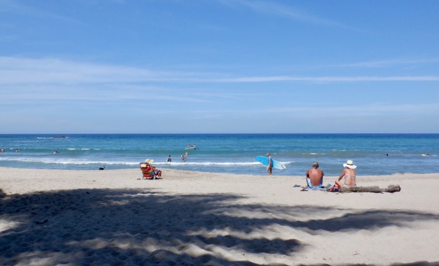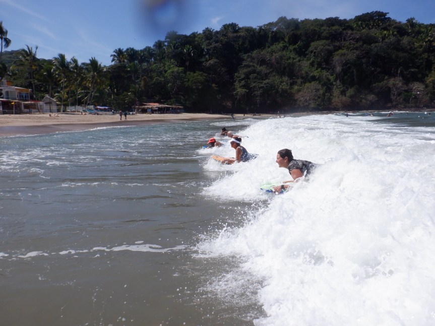 Hot and sweaty from doing my chores, I got the urge to get out in the water. I picked up my kick board and went out and caught a bunch of little shore pounders. There were quite a few people out giving it their best in the warm Lo de Marcos waves. Old timers and some local kids all smiling and charging the surf. A sunny afternoon brought lots of people out.
