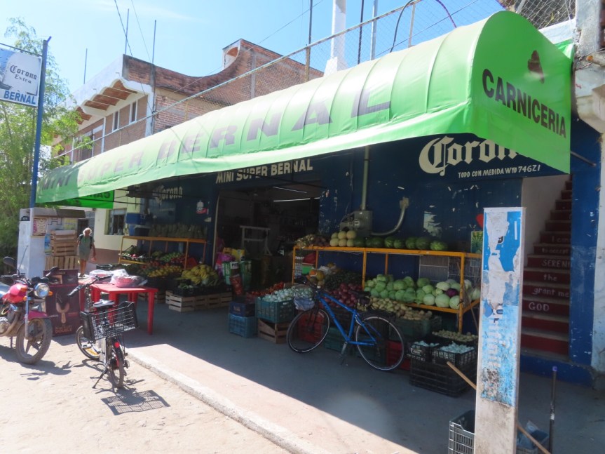 The Paraiso roadies were setting up the gear for tonight’s open mike as I jumped on my bicycle for a run into town. Cali’s been going through the dog food so I needed to restock her shelf. Bernal’s was packed with customers and I waited in line filling my grubby little basket with odd items that I really didn’t need as I inched my way forward, pickled chiles in a baggie, home made potato chips, cookies and a small baggie of spice drops. Never shop hungry.