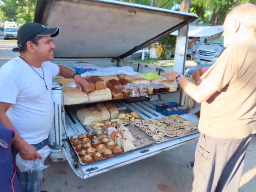 The vegetable truck came rolling in and I bought a few things and ordered some of his wife’s famous chile rellenos that he’ll bring by later in the day. I went out for another body surfing session wading through all of the Paraiso residents hanging out on the sand just outside the gate. Fun waves, lots of punch and a little distance to travel before the waves would back off at the deeper trench near the shore. I sat and dried near the gate then went back to wait for my rellenos. They arrived at the same time as the bakery truck. Two for one! I got my rellenos then checked out the offerings from the bakery. Awesome fresh bread, a lot like the loaves that my dad always makes at Christmas time. A got a loaf, a couple of pies and a jar of jamaica jam, made from hibiscus leaves. Sooo good!