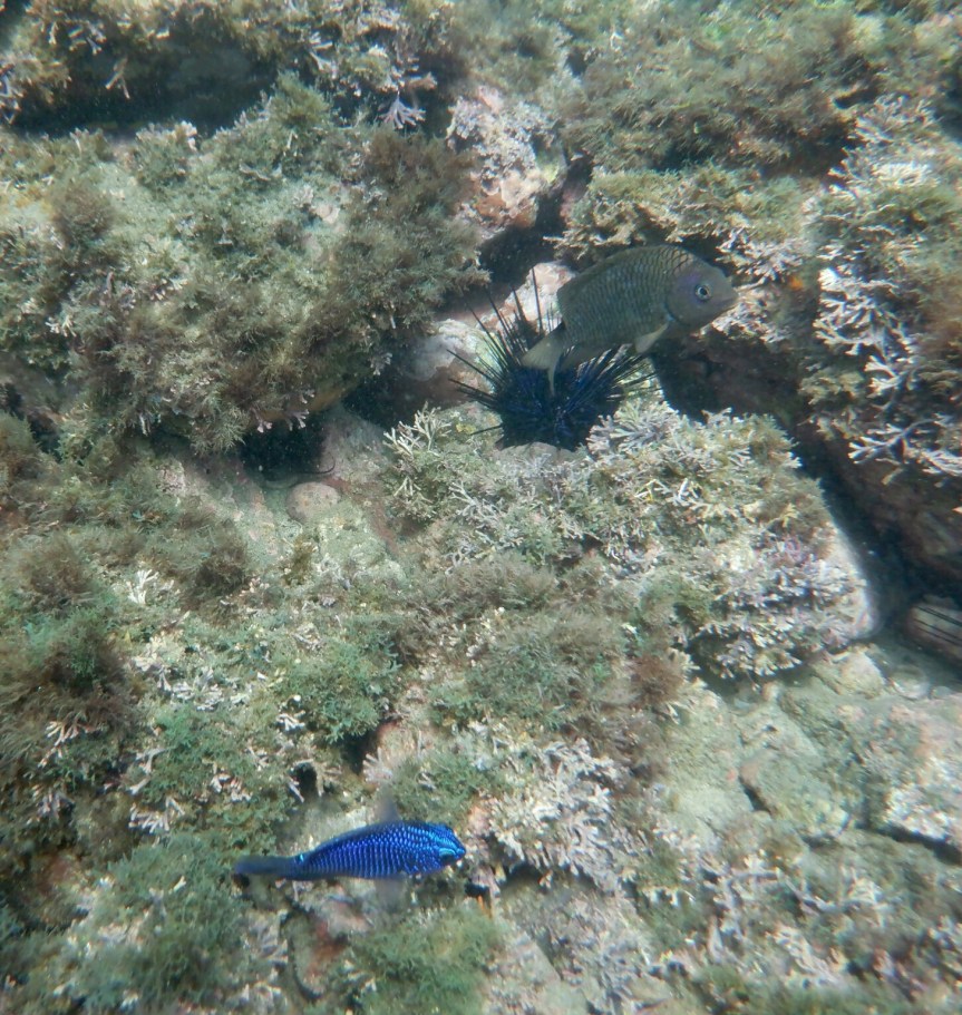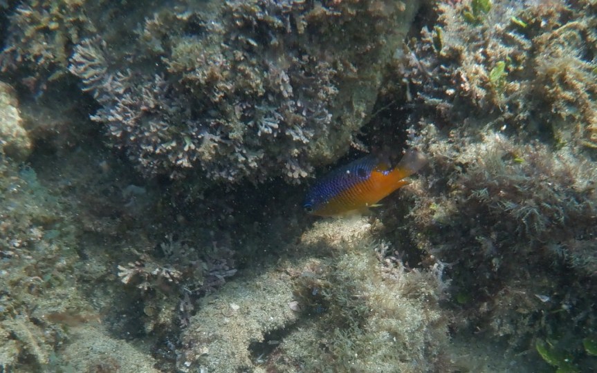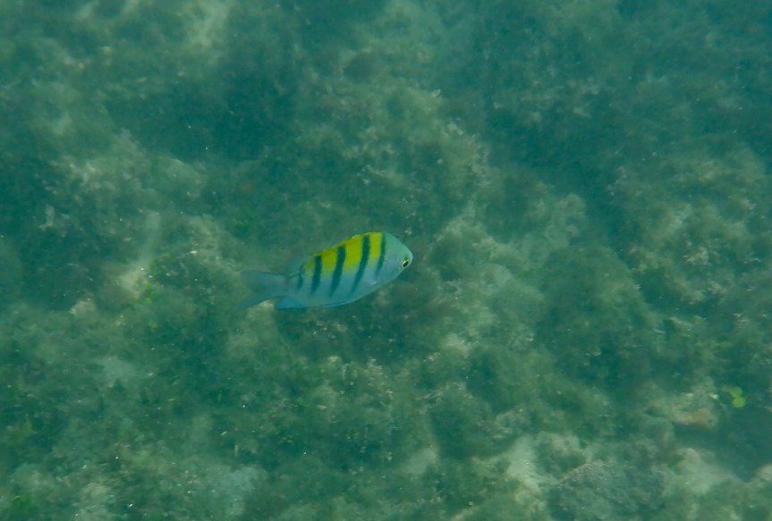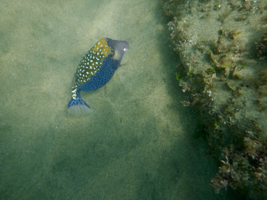 There were some cool looking blue fish, box fish, butterfly fish, sergeant majors and some cryptic fish camouflaging themselves on the rocks and frilly seaweed. The wave action was really light and the visibility was decent. I swam around for a while then made my way in past the sand where a few stingrays were loitering just to remind me to shuffle my feet.