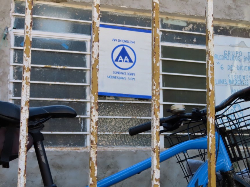 I sat in my chair near the Paraiso oldies occasionally attempting to appear sociable but never quite clicking with anybody. I went back to my little patio and typed up a post and spent time with my scurvy old dog. I read a little more ‘Breathing Under Water’ and got in a little nap. As five o’clock came around, I got in a quick shower then pedaled on over to the Wednesday afternoon AA meeting in town. Not as big as Sunday but it was good to spend time with the folks who came out.