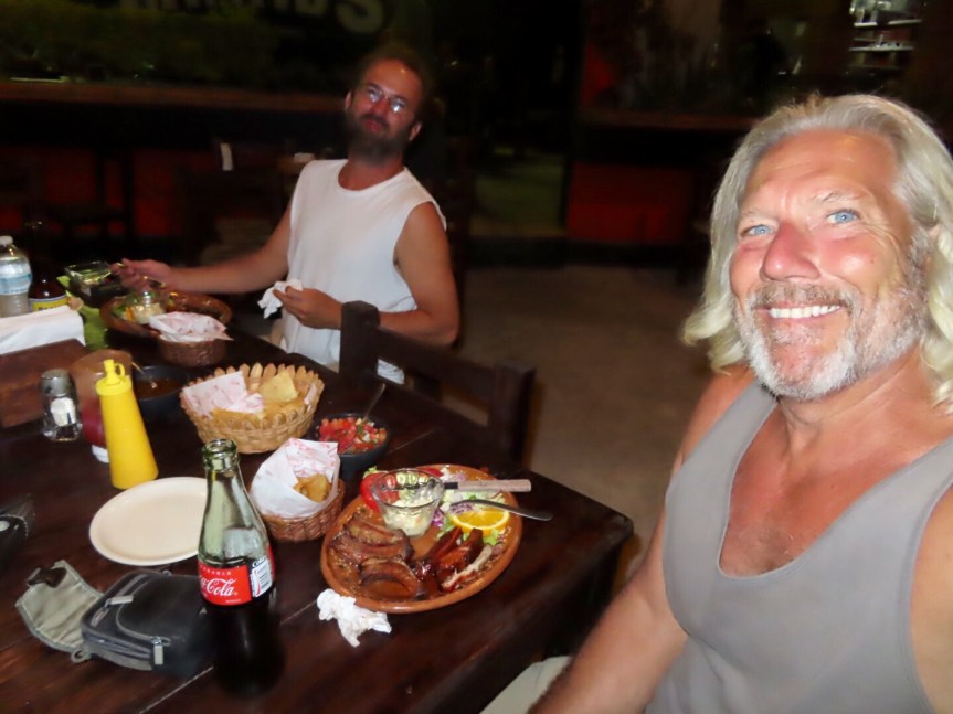 I lounged and read on the beach then went out for a body surfing session in the shorebreak. Next thing I know, my friend Alan is out there with me. Cool. I hadn’t seen him since Chacala. He’s been wandering around checking out beaches and ranches in the jungle. We agreed to meet up for dinner and he headed back over to his camp two doors down at Parota. At dusk, Alan came over and we rode the bikes into town and toured around. We decided to go bold and have dinner at Mr. Ribs, the most gringo looking of the big new restaurants in Lo de Marcos. A kid was busy barbecuing ribs and chickens on a parilla fired with a really fragrant wood. The ribs were good, but I fear the garlic is going to stay with me for days. A decent band was playing out front. Jean Claude, my next RV neighbor, came in with his family that they retrieved at the airport today. The place did a lively business, but not quite my style of dining.