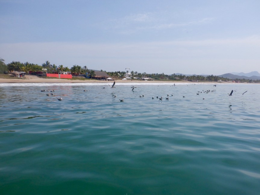 The water was clear for about six feet as we passed over coral heads and explored in diminutive coves keeping a watchful eye on the rocky shallows. We turned up the channel to the marina to see how the construction was going. They have a huge crane and obviously have some serious plans for making this more of a tourist destination. Birds were diving and reaping a harvest of fish as we made our way home and landed on the beach out front.
