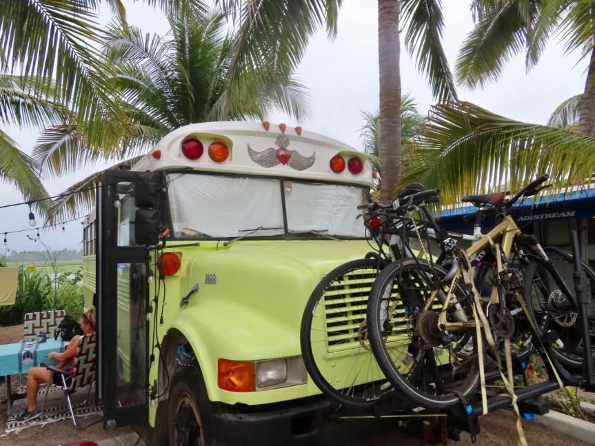 I was remembering the rutted, bumpy dirt road in but it is now paved, one of those facade cobblestone roads with, thankfully, smooth concrete lanes for the tires. It was an easy drive in. I parked at the end and had a look around. Maybe a little tight for an RV right at the break. I moved over to the new complex to the south and got a big palapa and a patio for 100 pesos a night. One of those times where it is advantageous that they charge by the person. So I have a thirty foot patio with electric and a light bulb for ~ $5.50 a night.