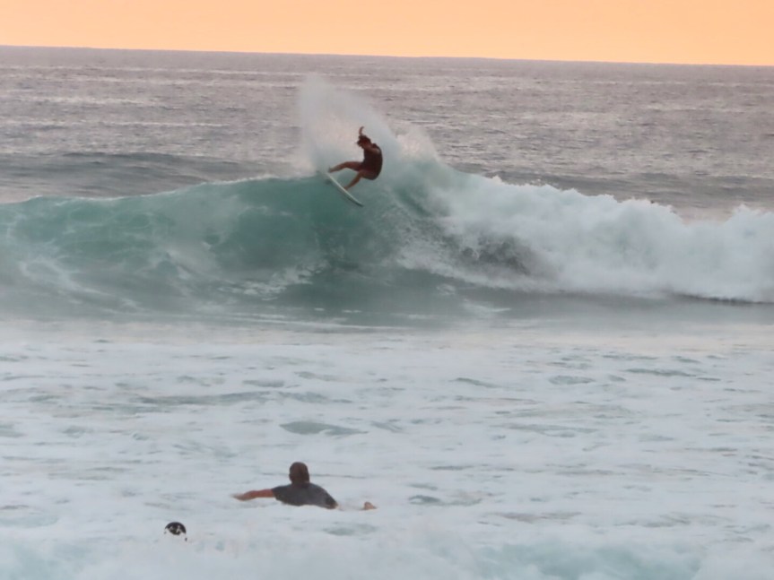 I took my chair out to the beach and sat a while watching the surf. Pretty decent swell, steady 4-5 foot sets rolled through at regular intervals. There was quite a crowd at the main peak, so I did little cleaning projects and writing until a few people went in. I took the second shift and paddled out and found a little zone between the two packs that worked for me. On the bigger sets, an odd wave would swing out to the south and I’d manage to get a nice right to myself. I caught five okay waves before heading in.