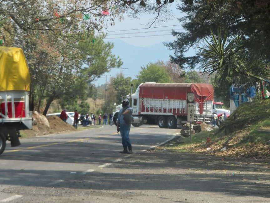 Today’s mission was to take an excursion to the nearby colonia of Paracho, a city famous around the world for the guitars that they make here in Michoacan. I had been putting aside my pesos and was planning to pick up a nice flamenco guitar from one of six or seven well known luthiers in the city. An extravagant birthday present for myself. Jose Carlos, my driver, came by mid morning and we turned north up into the mountains to get to Paracho. But it was all for naught. Before we could reach Paracho, a bunch of masked insurgents had blockaded the road with stolen trucks and weren’t letting any vehicles pass. They angrily flagged me stop photographing. They were trying to get something from the government by closing the highway, I’m not sure what. There was nothing to do but abort the mission.