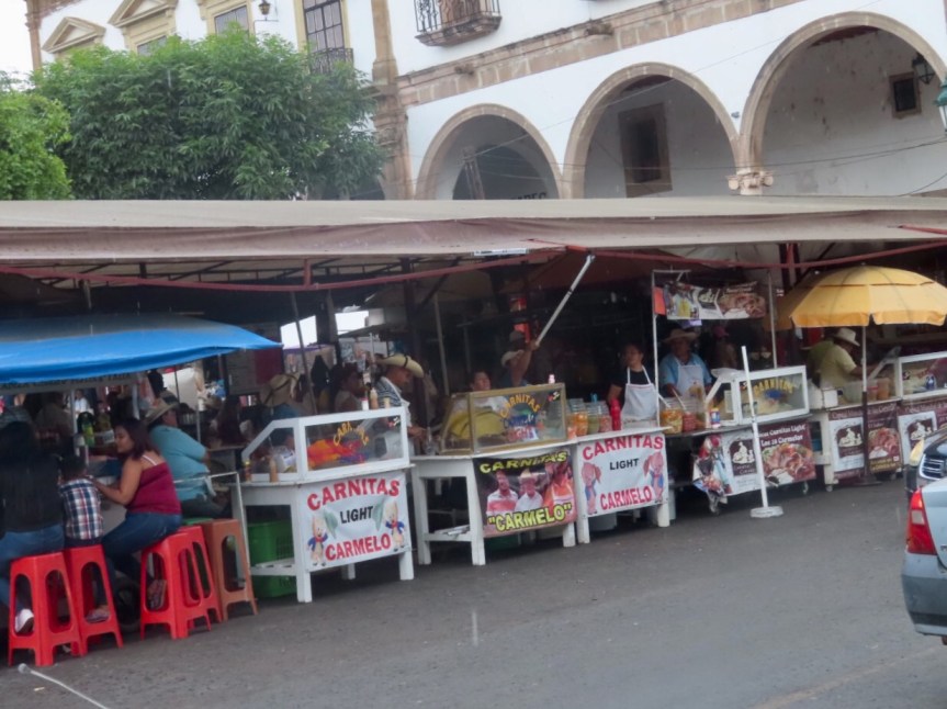 This entire area of Michoacan is famous for their savory recipes for making carnitas. When we pulled into town, an entire plaza in the center is dedicated to cooking them up in different ways. We got a half kilo in a brown wrapper and squeezed onto a table in the busy square to eat our tender treats.