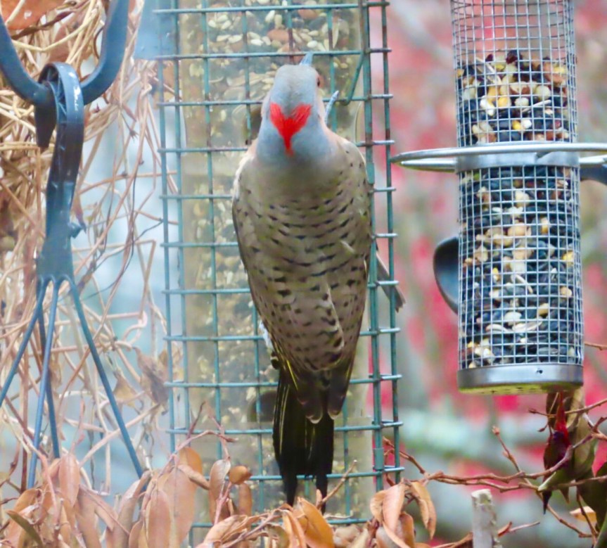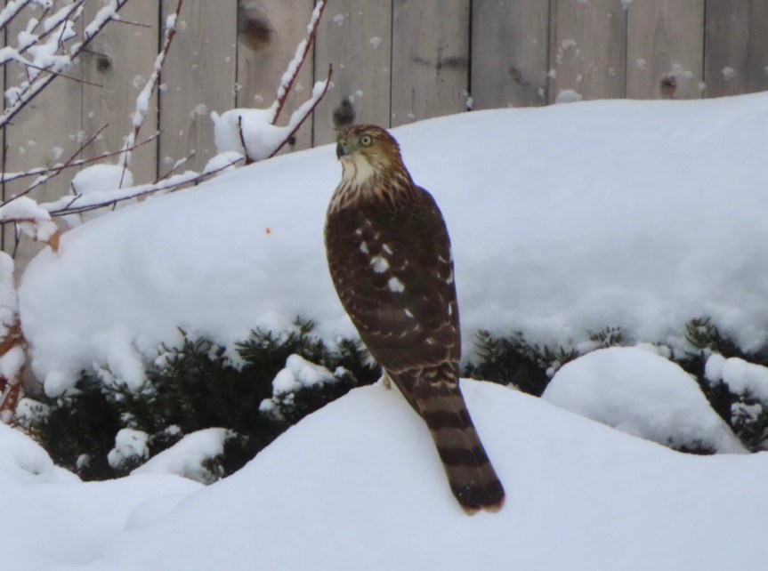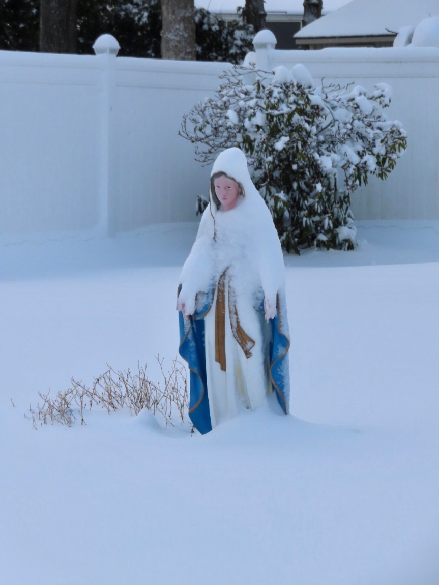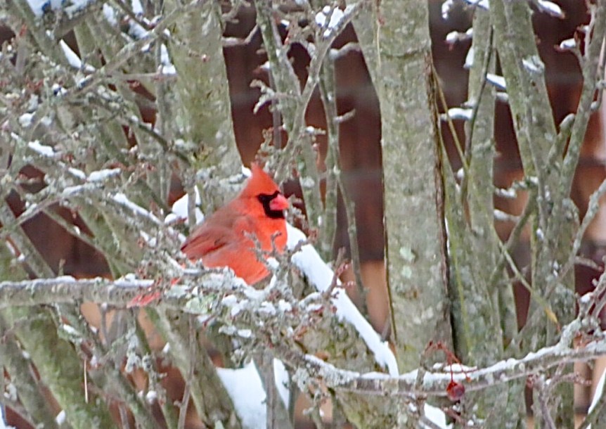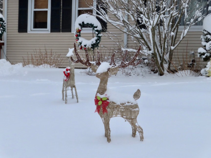 A few cars came slushing or sliding by but the neighborhood was mostly calm and quiet, the kind of easy silence gained from an extra ten inches of insulation dusted onto everything. We enjoyed a nice snow day ourselves watching the birds outside pecking away at the seeds that PJ replenishes for them daily. We moved the feeders a bit further from the patio to discourage the rogue kamikaze bird from challenging the window. Although now, the local hawk is feeling a bit more emboldened and takes an occasional swoop down on our little flock to see if he can catch someone being a little less than attentive to their environment. The yard is beautiful with hidden crystals in the snow sparkling when the sun hits them at just the right angle. It’s beginning to look a lot like Christmas.