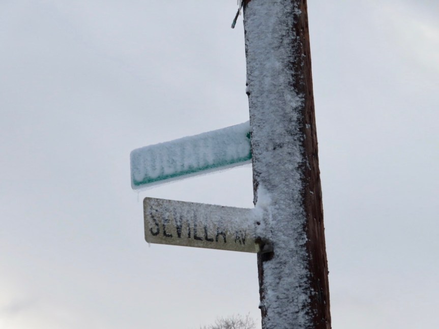 Wrapping warm scarves tightly around our necks, we stepped out into the chilly day. All of the houses were covered in icing like so many gingerbread cottages lining the way. We trudged as far as the lake where its waters were ruffled by the consistently blowing wind. Christmas decorations adorning people’s lawns took on a new perspective with the additional “flocking” they received from the storm.