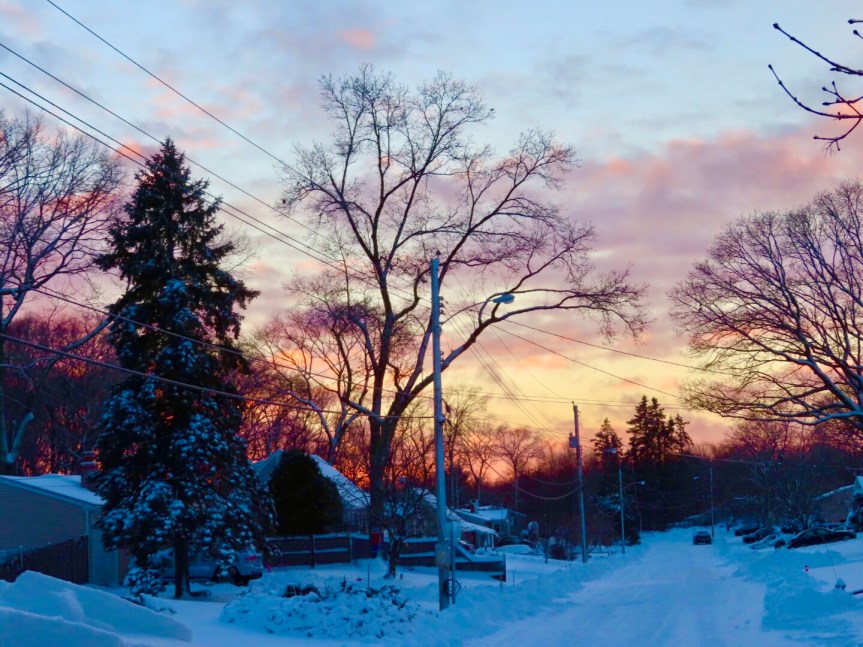 The morning brought colder temperatures and a neighborhood transformed from its daily ho-hum existence into a picture postcard panorama. The snow plows whose brittle scrapings punctuated our dreams the night before had pushed up banks against the driveway and lawn. A little shoveling with the help of the boys next door quickly opened up a corridor to the street and the world beyond.