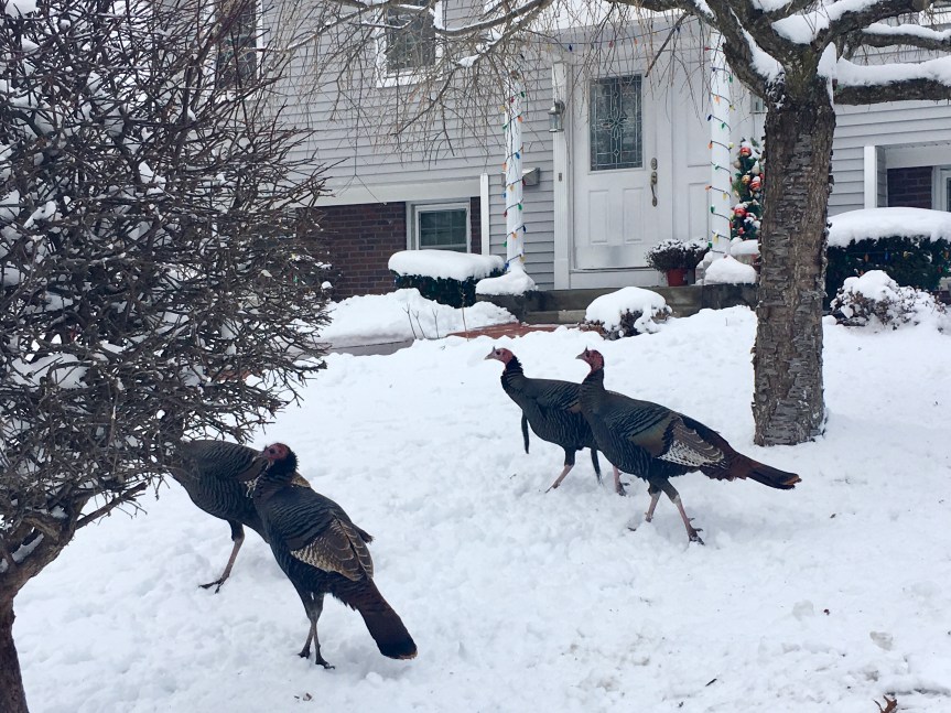 The telltale signs of the renegade rafter of turkeys that reign over the block appeared along the curb. We were getting close. It wasn’t long before we came upon the group poking around through the bushes in someone’s yard. There were fewer than usual. Some of the less hardy gobblers must have decided to take a snow day.