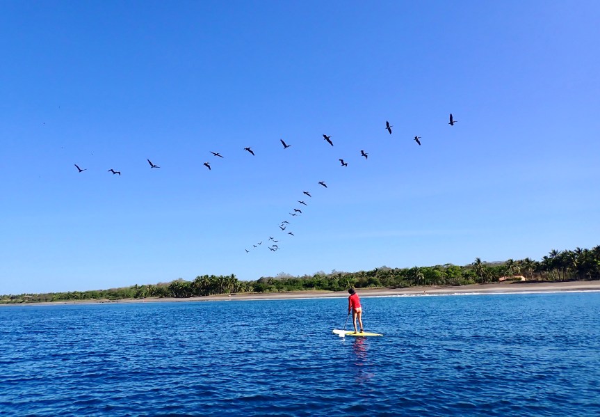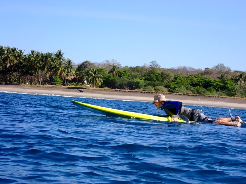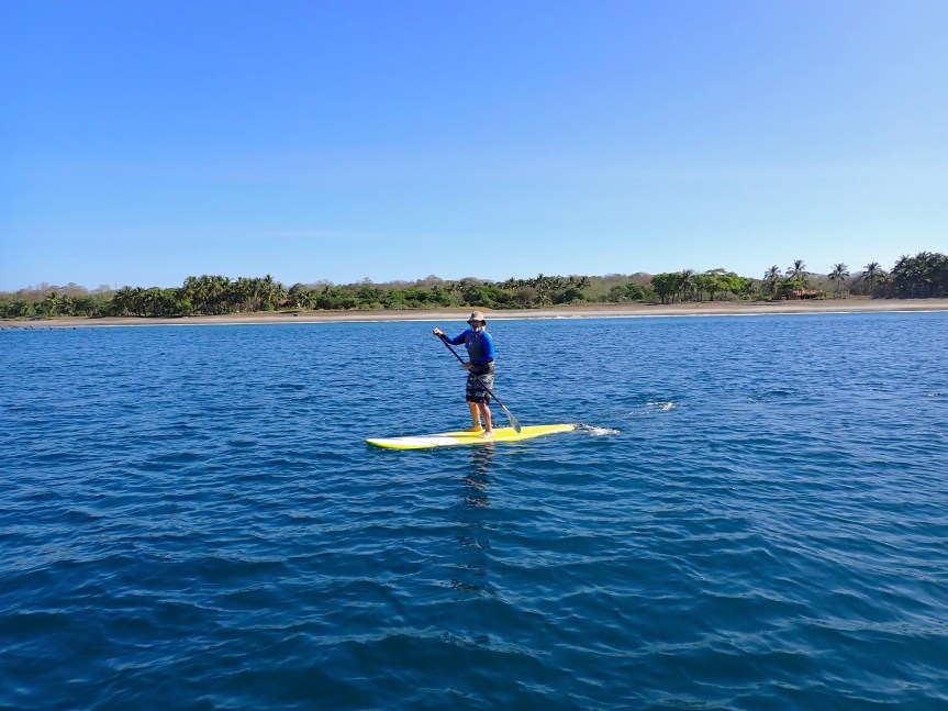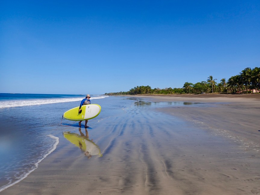 The wind was relatively calm this morning. The idea of starting the day with a paddle quickly took hold. It was a comedy of errors as we assembled our gear and drove down to the turtle sanctuary in Junquillal to launch. First, I remembered everything needed for a successful paddle except – the paddles! I raced back to the casa to grab them and as I was swinging around the last corner to the house, the rear hatch popped open. I though nothing of it, closed it back up, grabbed the paddles and returned to the beach. My sun hat was missing! I jumped back in the car and raced nearly the whole way home and there it was, lying in the dusty road.