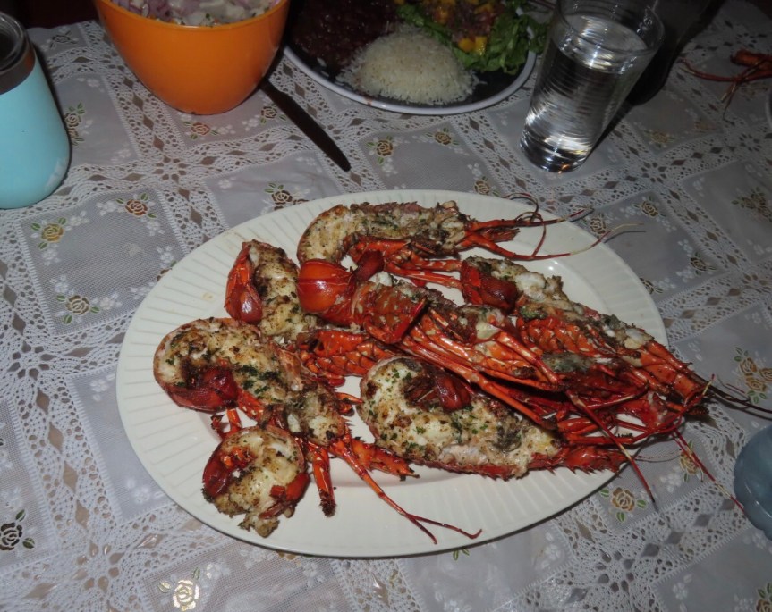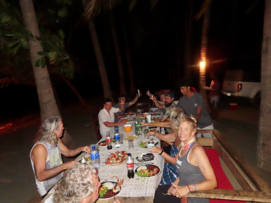 Sean’s crew grilled up the lobsters on the open wood fire and we all sat down while Michael and Sean kept reloading the platters. The never ending lobster plate on the sand in Playa Lagarto. Salad, rice beans, platanos, ceviche, lobsters and conversations. I think Sean is onto something good here.