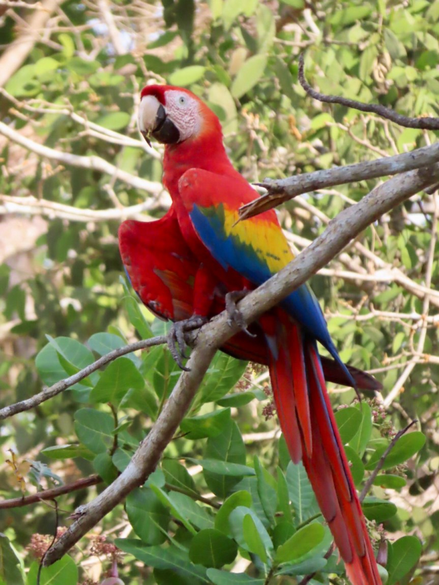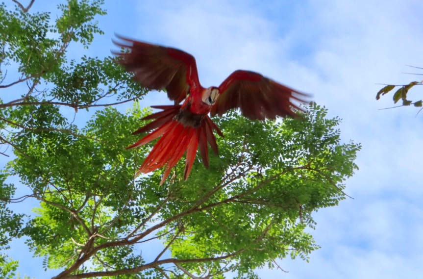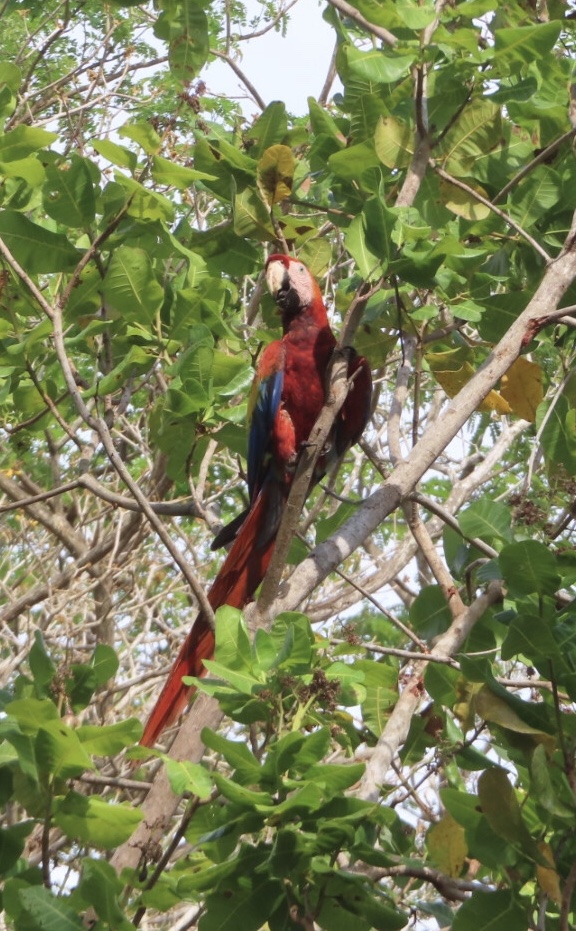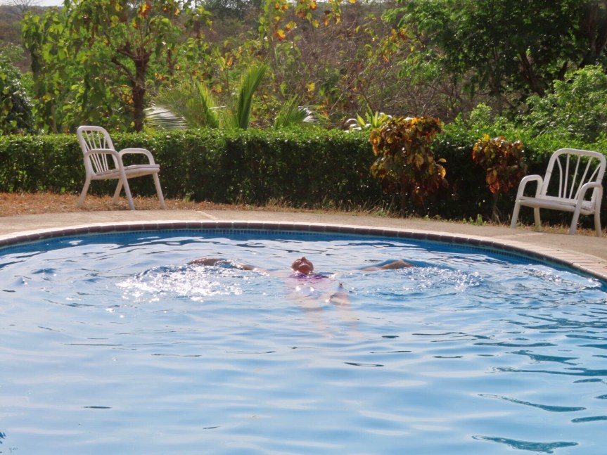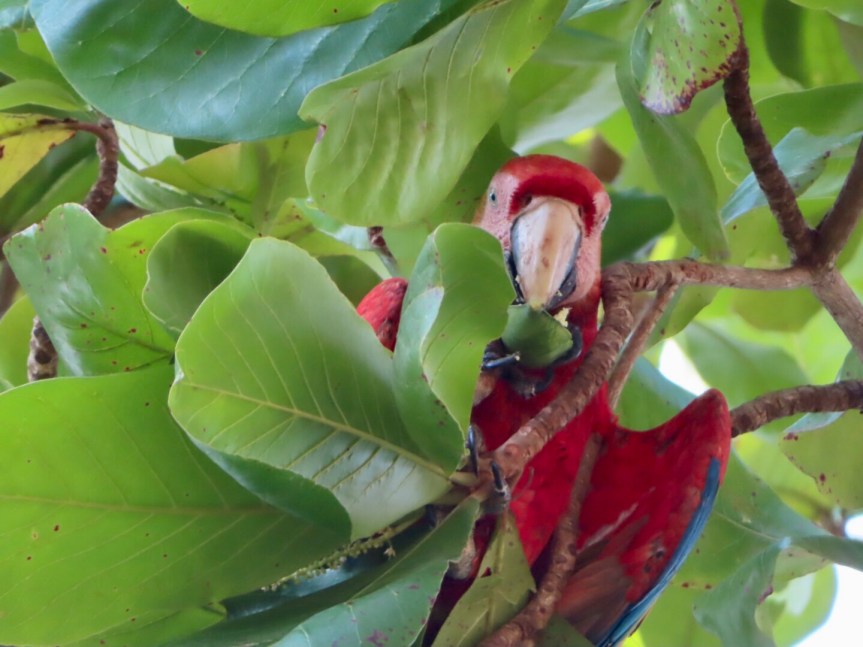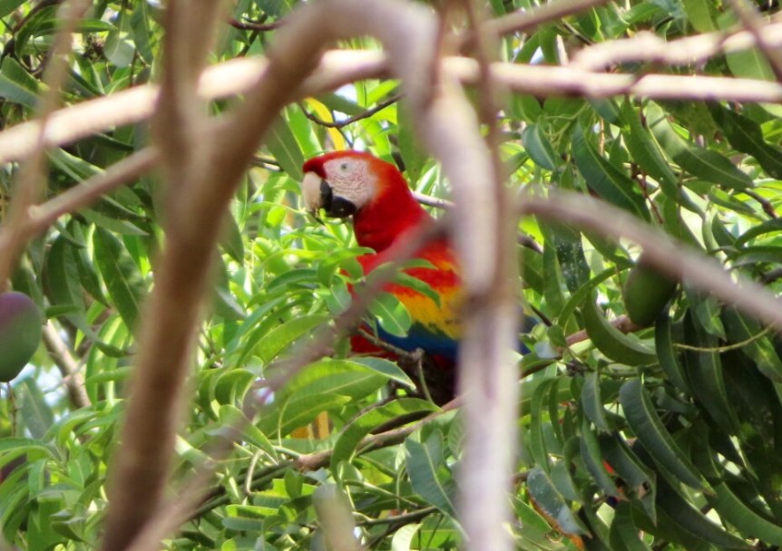 Hauling all of our crap over to our cabina had me breaking a hard sweat, so the first order of business was putting on some trunks and jumping in the pool. As we walked to the pool, the trees suddenly filled with scarlet macaws flying in from the west. We watched them pick cashews and munch on the fruit as they squawked loudly and chased each other from tree to tree.