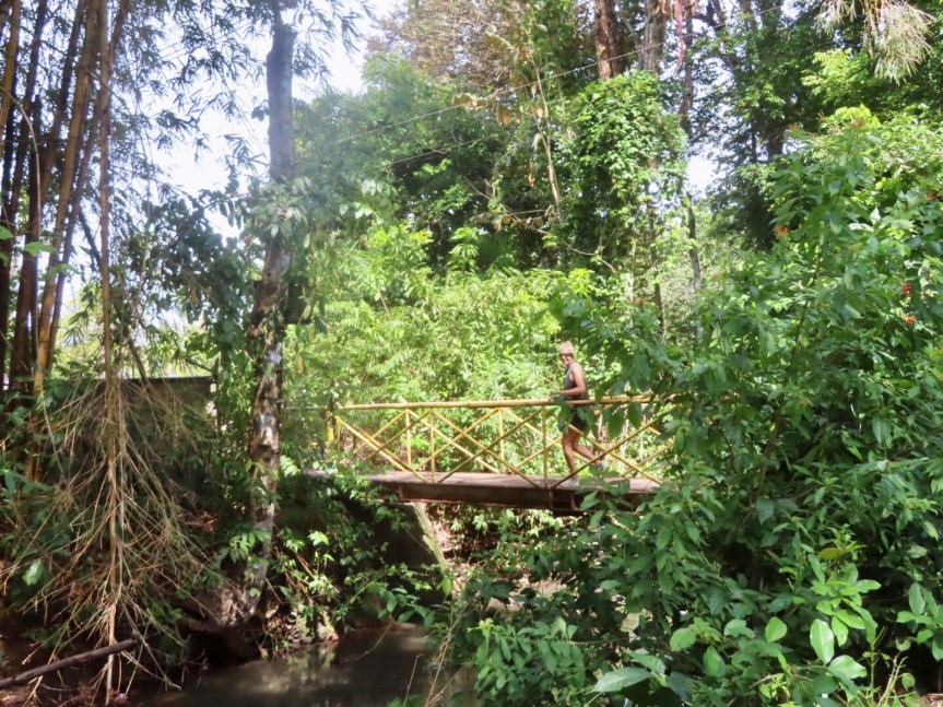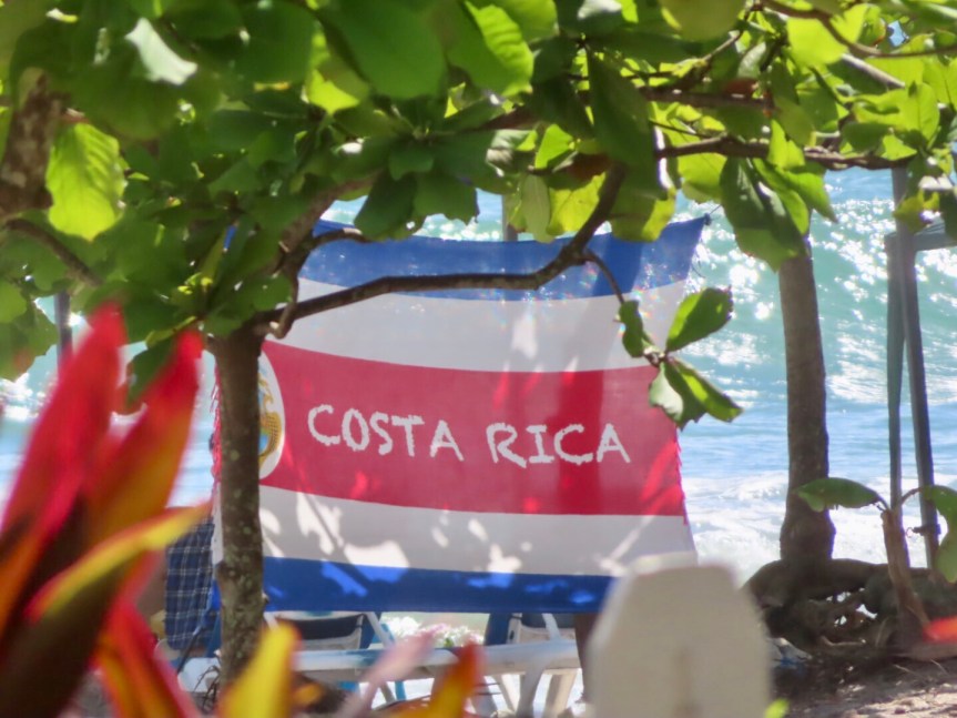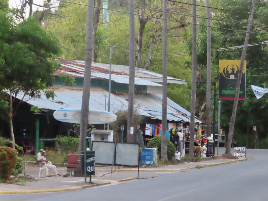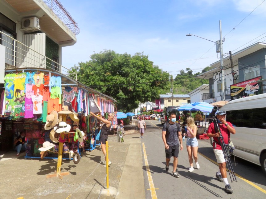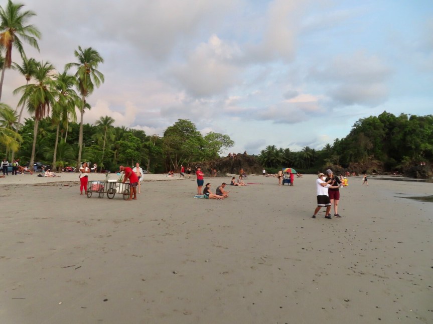 As the heat of the day hadn’t quite arrived in full force, we continued on up the hill and around the few blocks of the neighborhood that lead up to the park entrance. There are a few cute boutique style hotels and some quaint restaurants. PJ, as always, gravitated towards the souvenir shacks. She found a little sundress that caught her eye and the shrewd salesgirl talked her into buying two to get the “especial price”. I stood and sweated as the fitting and transaction was taking place. We turned down our trail to the beach right at the entry gate to Manuel Antonio Park. There was still a decent trickle of visitors getting their bags searched for contraband bananas intended for the monkeys.