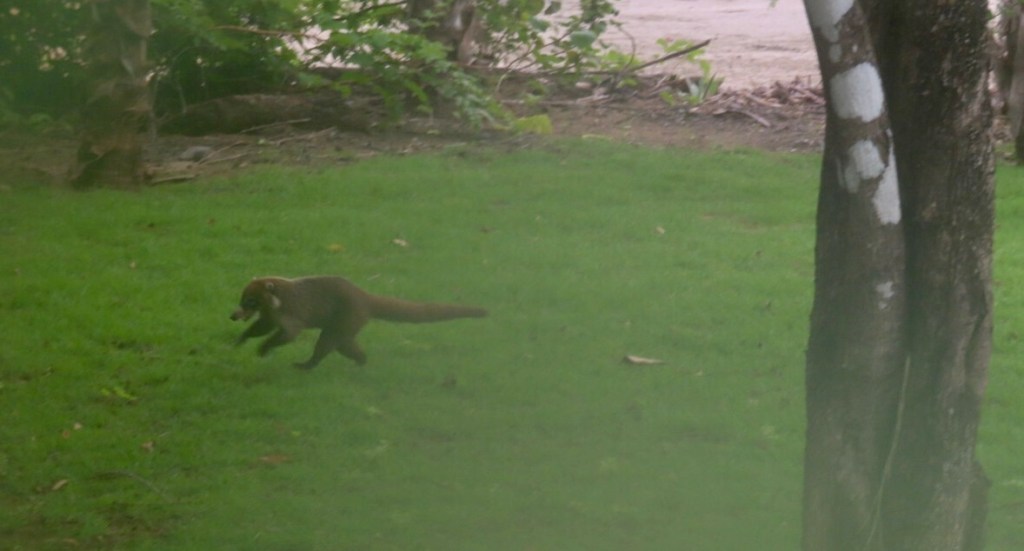 The condo is luxurious and spacious with a big patio area facing the jungle between us and the estuary. You never know what’s going to emerge from the trees. The first day while I was paddling, PJ spotted a coatimundi strolling across the lawn. A pandemonium of parakeets keeps up a chaotic chatter in the trees. Not the smaller budgie types but more like lovebirds with green parrot coloration. Pericos they are called here.