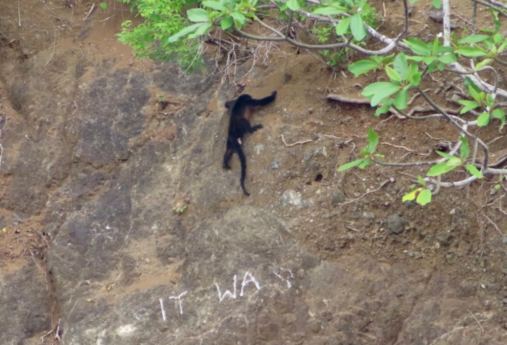 The past few days a lone howler monkey has been cruising out exploring the neighborhood. A good sized male. I’d never seen a howler come down out of the trees before. Sunday, I was on a zoom call with a group of friends in California when I saw something moving behind me across the lawn on the screen. I turned and he was casually sauntering on all fours on the grass going towards a large tree by the pool. Yesterday, he ( I’m assuming it’s the same rogue wanderer) was cruising along the beach at low tide and crossed the beach rocks to the island and climbed up a bank and into the trees on the island. The island is only accessible at low tide so I’m not sure if he stayed there or came back before the tide came up.