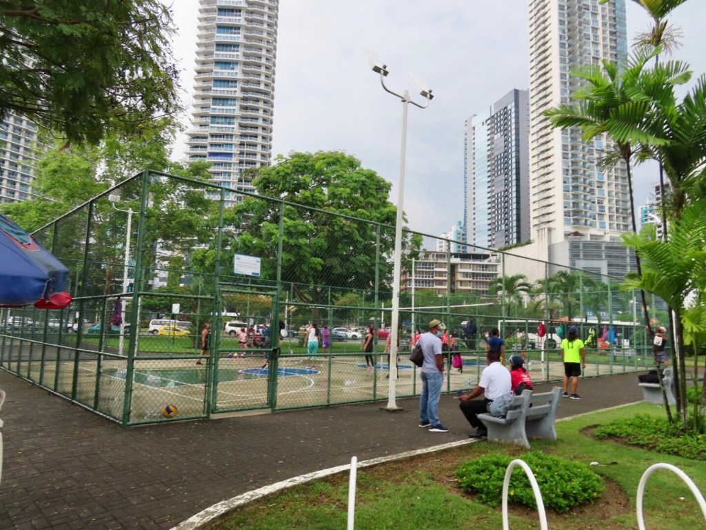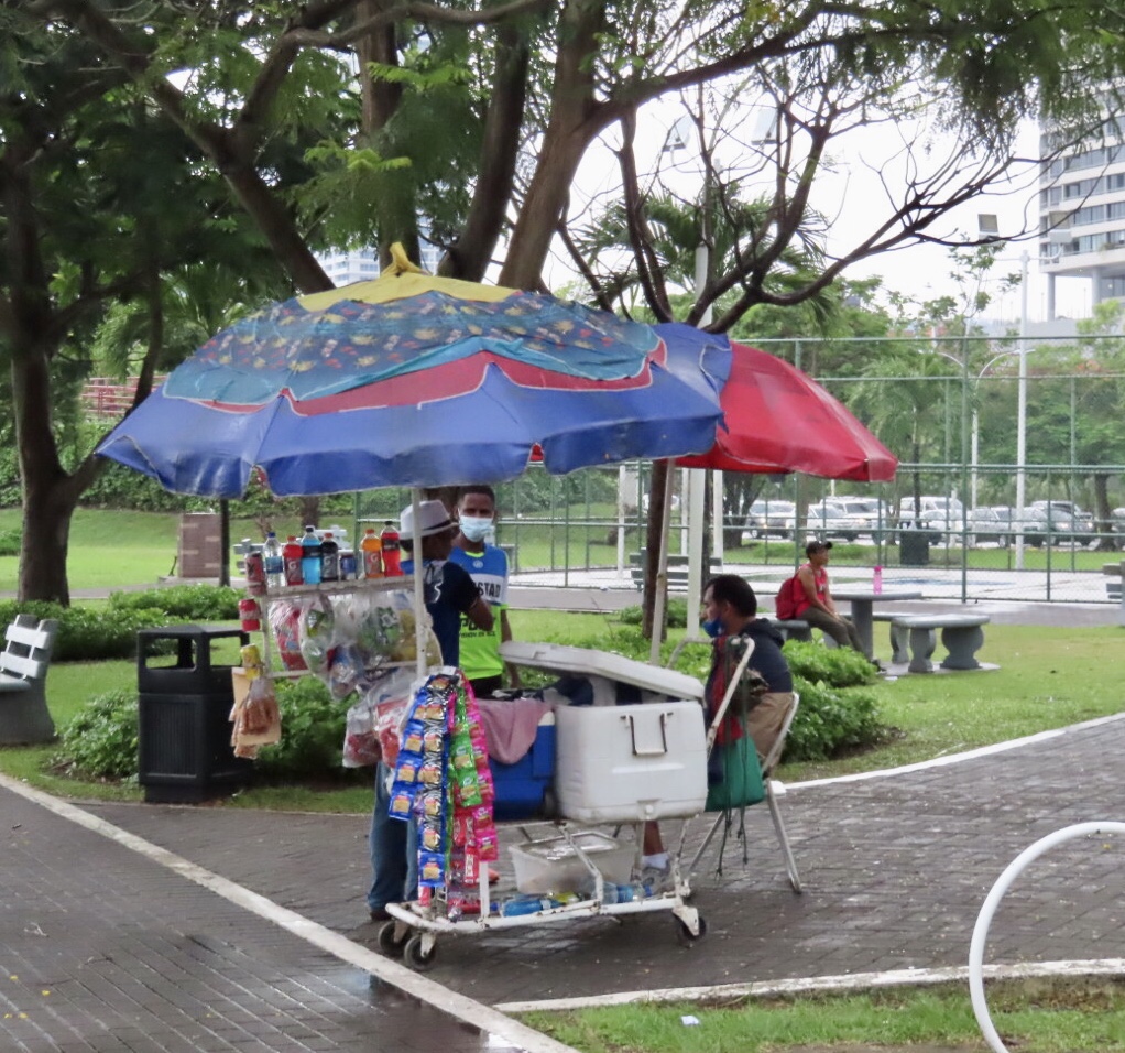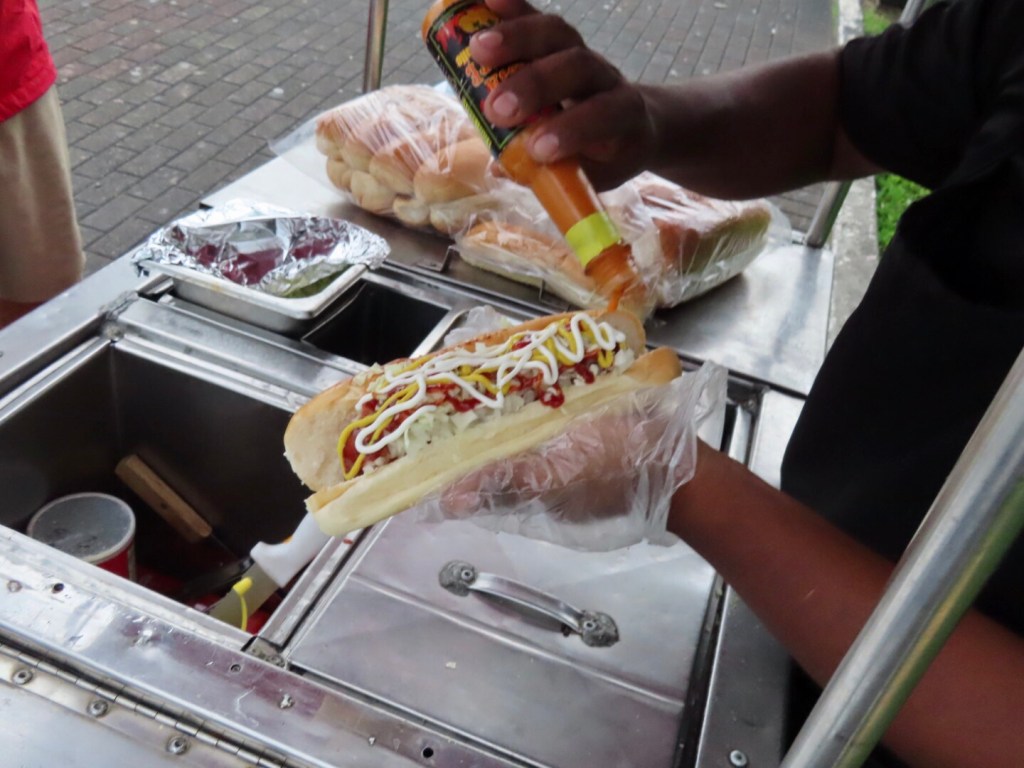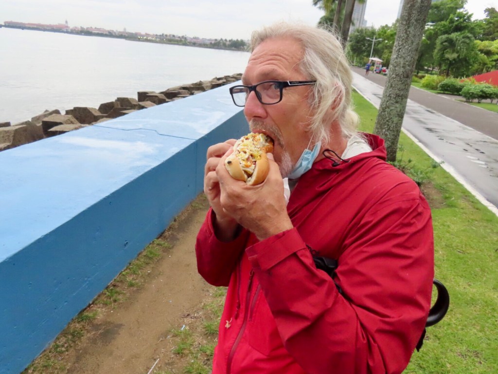 Along the wall, feral cats had staked out large swathes of territory near the harbor. On ball courts, kids were playing volleyball and a form of fenced in soccer on what looked like tennis courts. Vendors along the walkway were selling snacks, juices and sno-cones. What’s that up ahead? Ah, it’s the hot dog guy I’ve been scouting for. I told him to throw on the works Panamanian style and he loaded that wiener up right down to the hot sauce and Pringles crumbs.