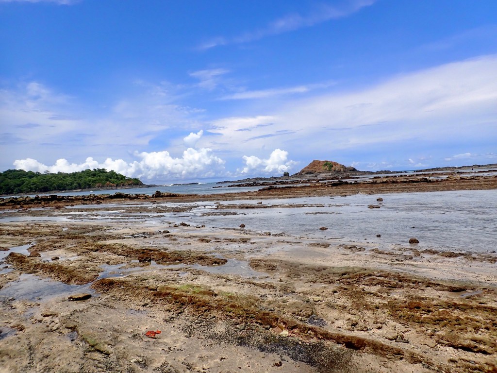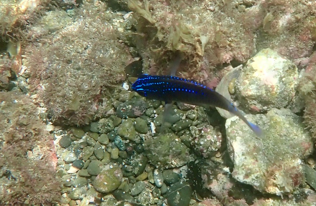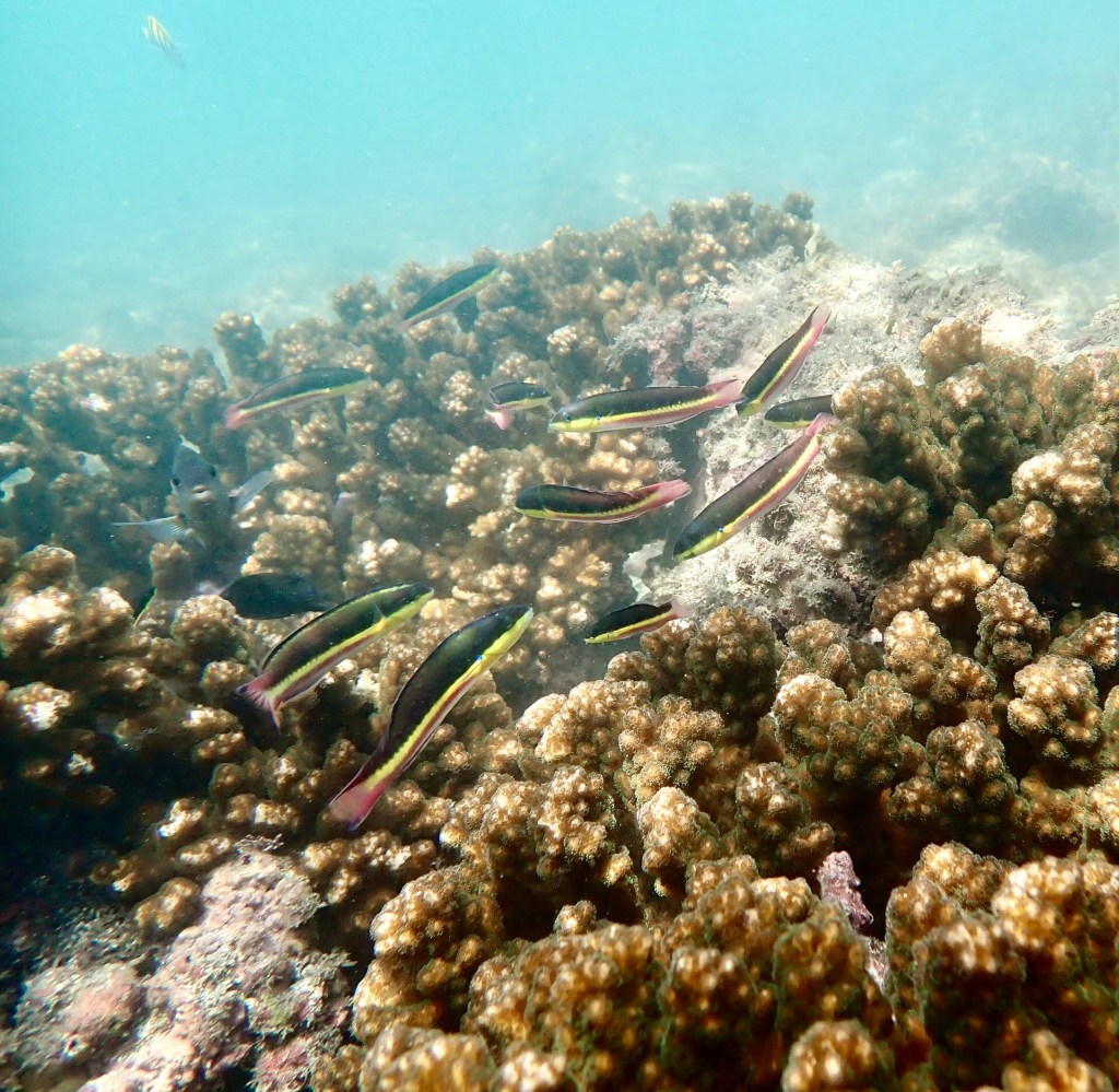There is some coral reef inside the cove at La Playita. The tide was extremely low when we masked up and hit the water. There were lots of areas with barely enough water to float above the bottom without touching. We soon came upon schools of colorful wrasses and sergeant majors. PJ headed over to the far side and waded out of the bay onto the island to look into the tide pools.
