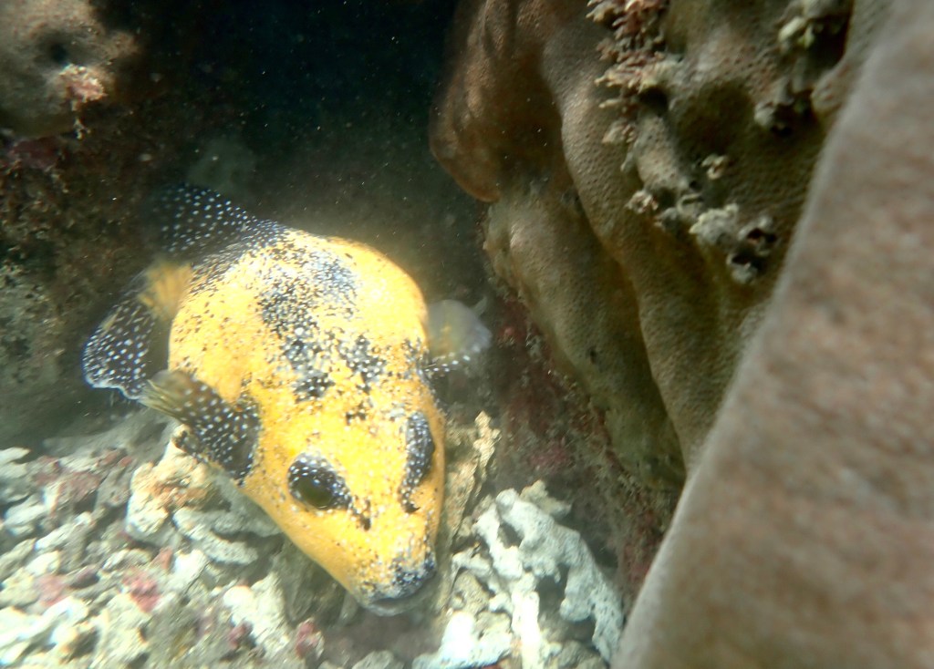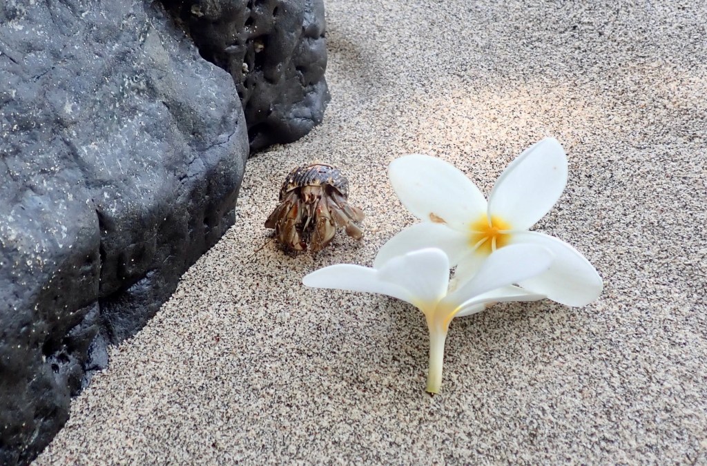 We came upon some more stands of coral on the way in with box fish, damsels and a crazy looking yellow pupfish. It was a fun excursion and we spent maybe an hour and a half scouting the cove for sea life. We found a comfortable spot in the shade and watched the hermit crabs parade past under the scented branches of giant plumeria trees.
