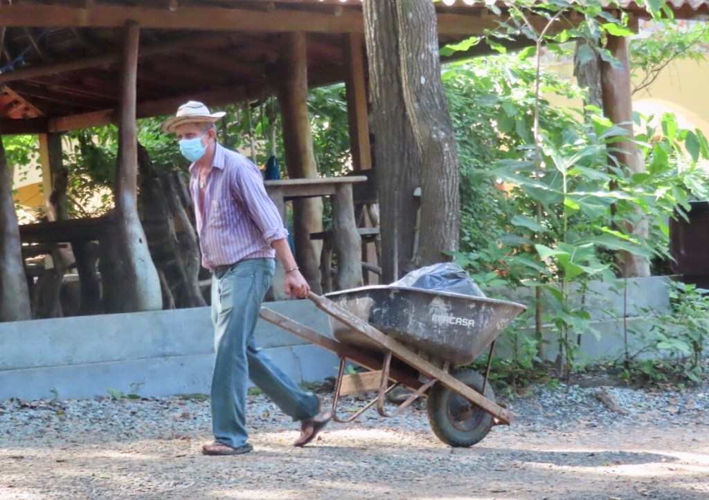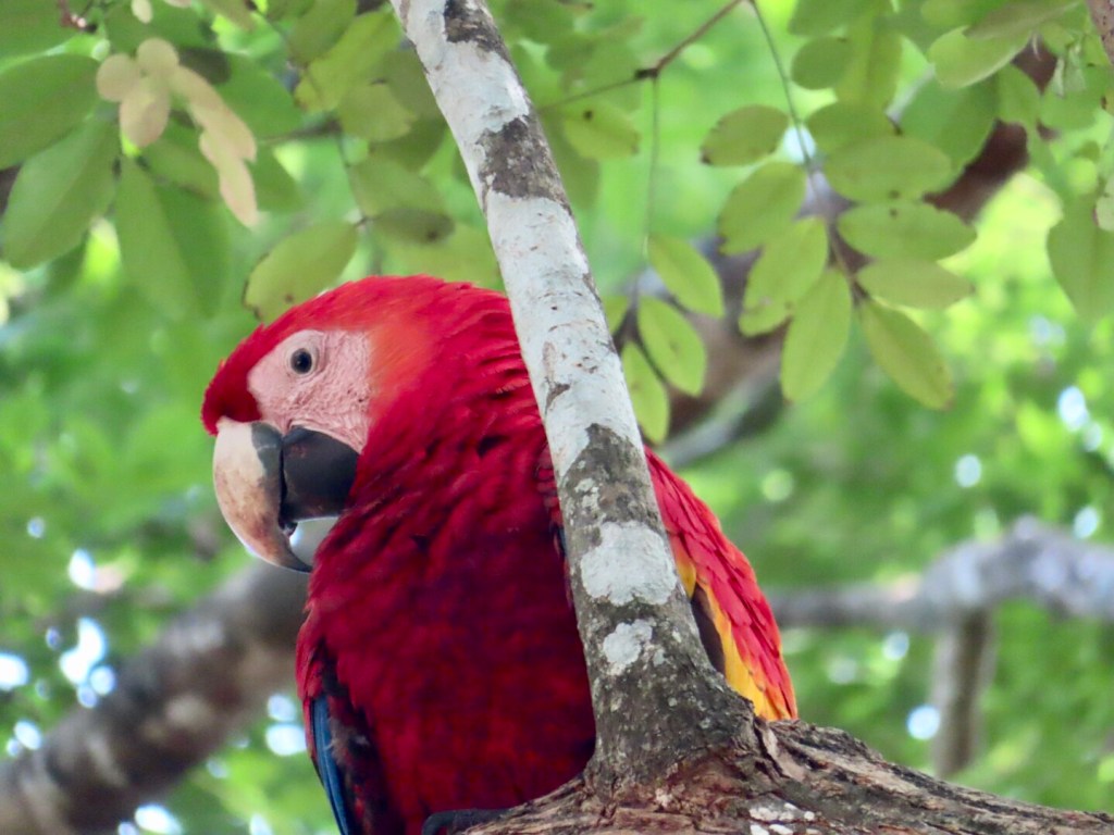 We were slow rolling hobos this morning. It was close to ten when we walked over to the restaurant for some coffee and breakfast. It was Panamanian typical fare, eggs and their version of corn tortillas, thick corn cakes fried in oil. The guacamayas came flying in for their breakfast, all scarlett, blues and yellows. We sat watching them come and go, amazingly beautiful in flight.