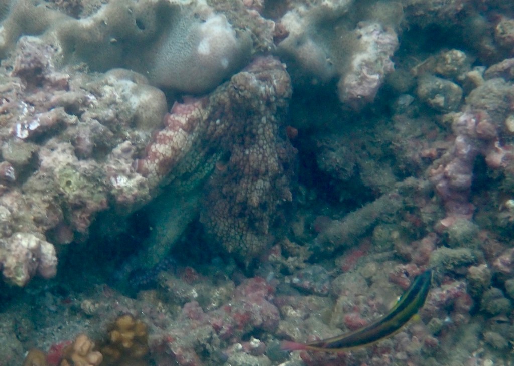 The coolest thing we spotted was an octopus hiding inside the reef. I’d seen her hurry under the shelf but knew if we remained still that her curiosity would get the best of her and she’d come out to see who it was that floated outside her nest. They are so smart!