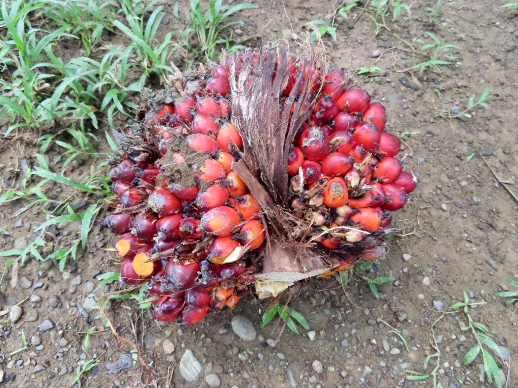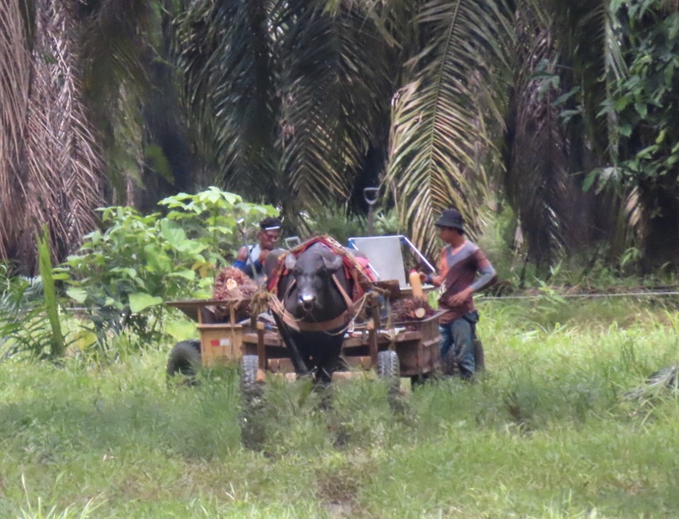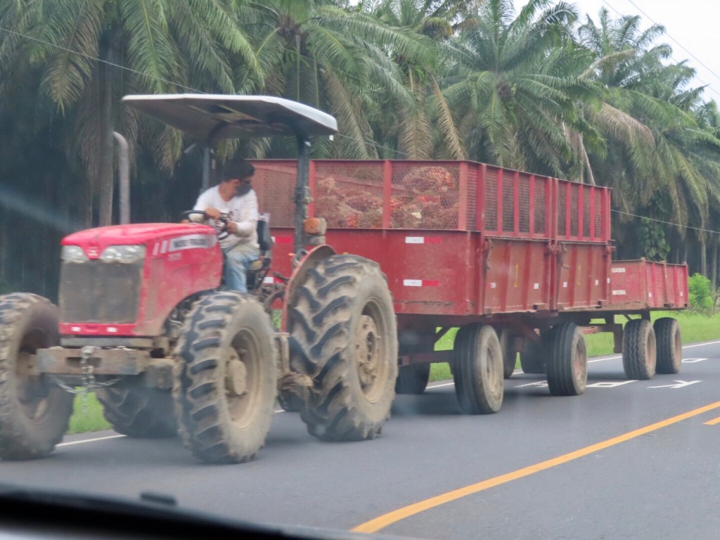 The roads are slowed by tractor trains hauling the big palm berries. Carts drawn by mules, motorbikes or water buffaloes collect the palm fruit from deep inside the groves and gather it in big containers that are hauled to the rendering plants and squeezed for their oil. Whole communities are dedicated to the palmeras and to a lesser extent, the rice paddies that define the region.