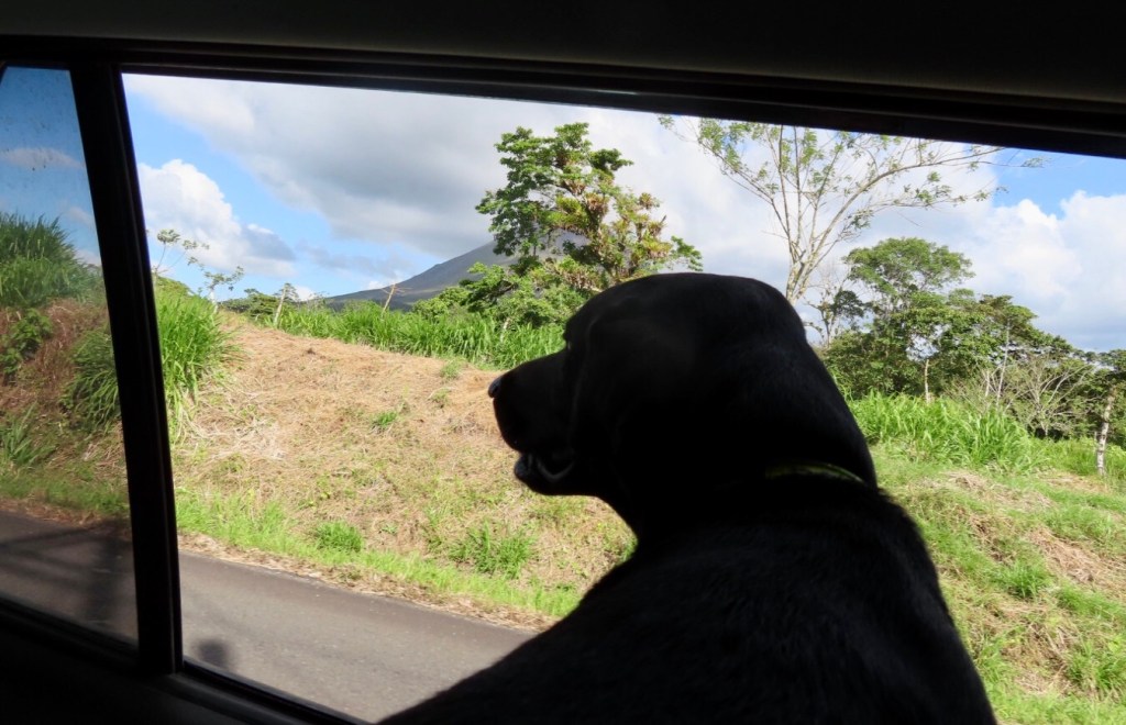 A passel of pizotes were waiting for us around a bend as we began to get near the now plentiful spas and hot spring resorts. Their little noses were wiggling hoping for a hand out as they lined up at the car window giving us the sad eye. Oso didn’t know what to think. He stood quietly at his window observing the activity.