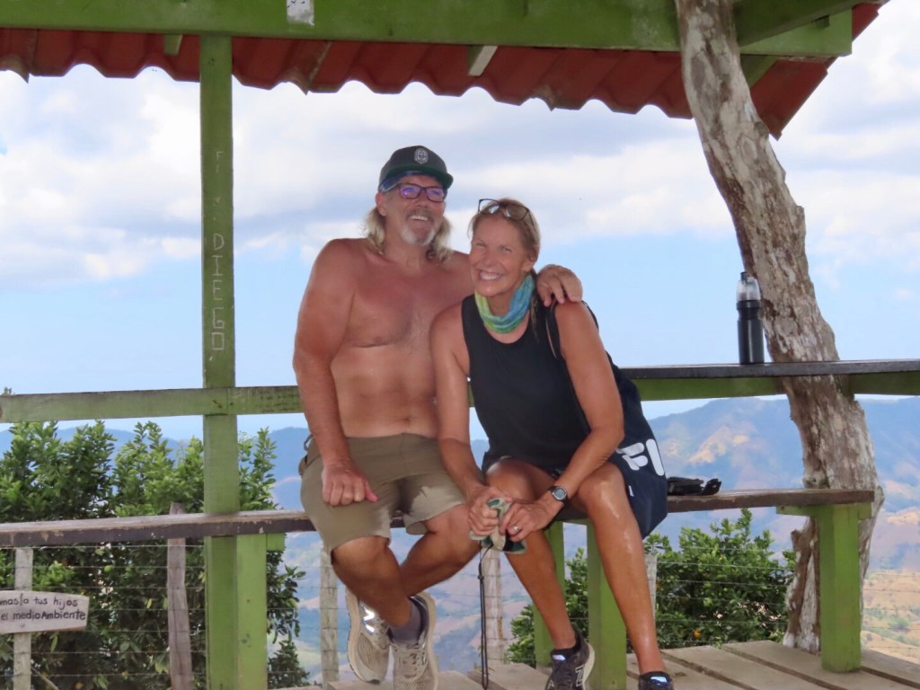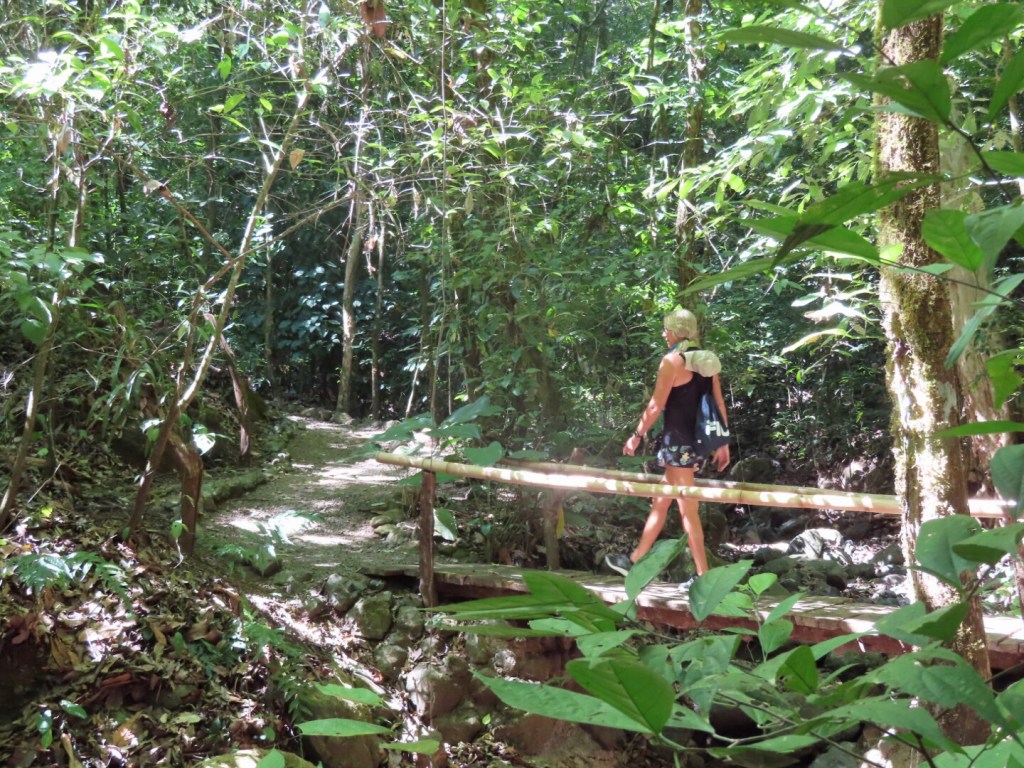 After we re-emerged at the trailhead, we decided on a longer hike up to the mirador or overlook up the side of the mountain. We grabbed our water and started busting a sweat as the trail began to gain in altitude and wind its way uphill. We spotted some cool birds and a pair of pisotes that quickly climbed down from their tree and ran off up into the jungle. The path hugged the hillside sometimes becoming a narrow ledge before dropping into small valleys with rickety wooden bridges.