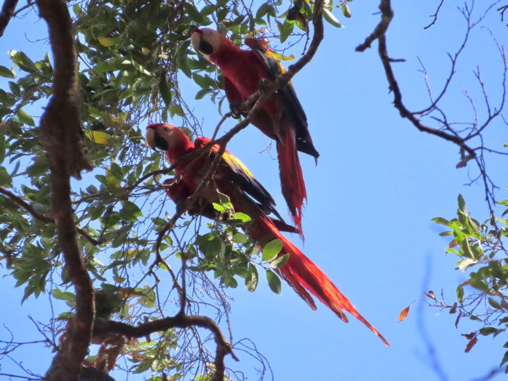 Along the way, we pulled over to have a look up into the tall trees where a group of scarlet macaws were frolicking in the upper branches. Lower down in the same large guanacaste tree, a family of howler monkeys were relaxing in the shade. A two for one animal sighting before even reaching the river!