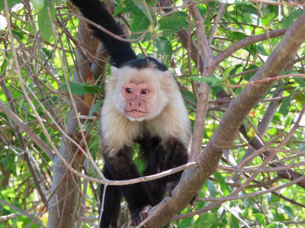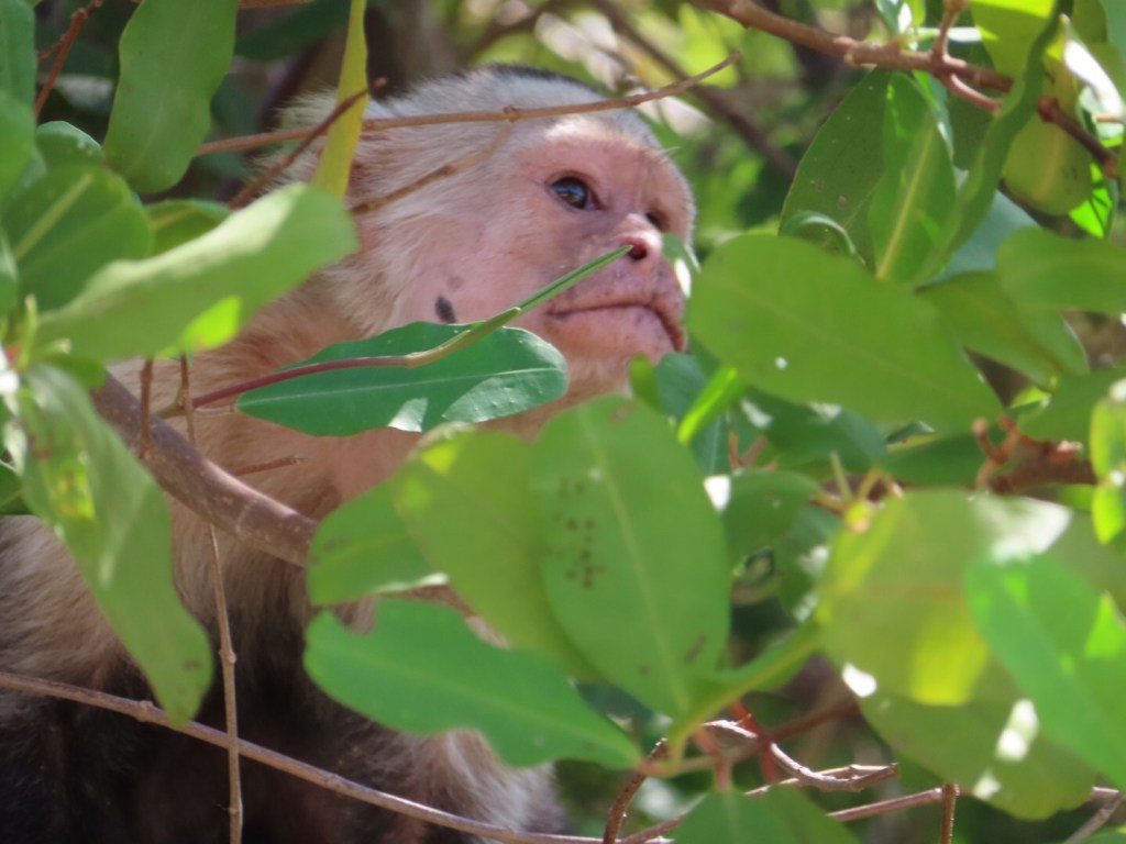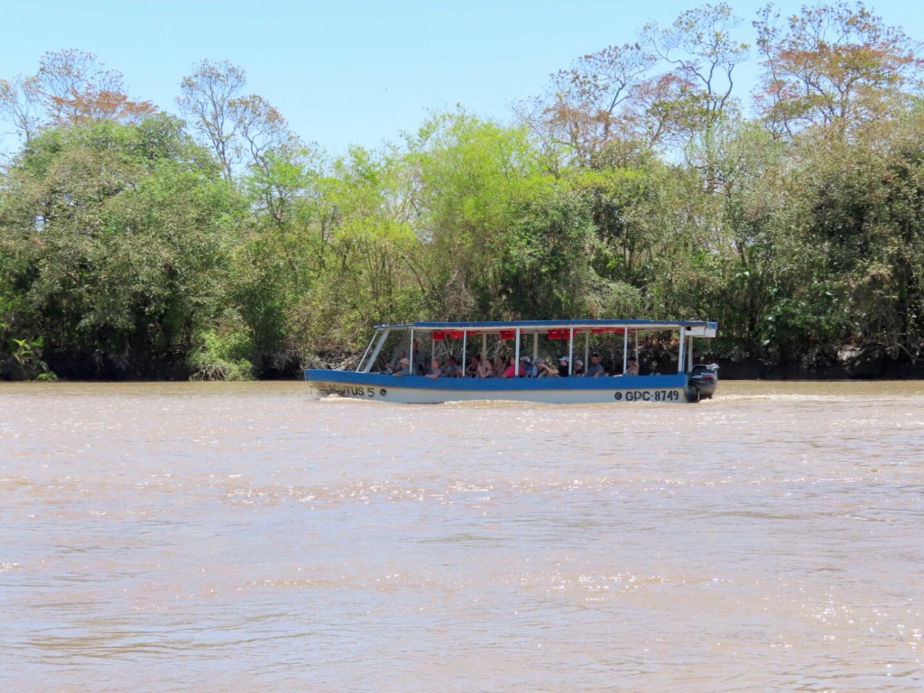 Down at the dock, we were loaded onto a canopy covered boat with a few other couples. There was plenty of room, so Ama, Chris, PJ and I took over the stern of the blue and white watercraft. We only had to cross to the far side of the river to see a troop of capuchins, Costa Rica’s white faced monkeys, playing in the trees along the bank. We began to slowly motor upriver hugging the far shore where we saw numerous birds and a large crocodile.