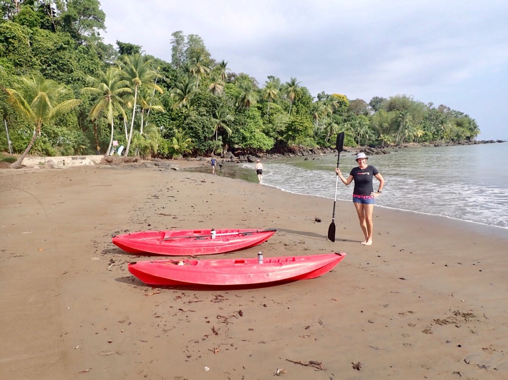 Passing under the pedestrian bridge to Playa Cocalito, the river begins to narrow and meanders beneath jungle canopy filled with wild noises and occasional rustlings. No great wildlife spottings. A random bird or two but no crazy crocodiles or hungry piranhas. We turned around when it started to get shallow and reentered the ocean and paddled across the bay to the center of town before returning to the beach by the hotel and parking the kayaks.