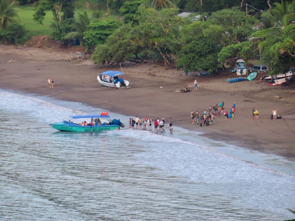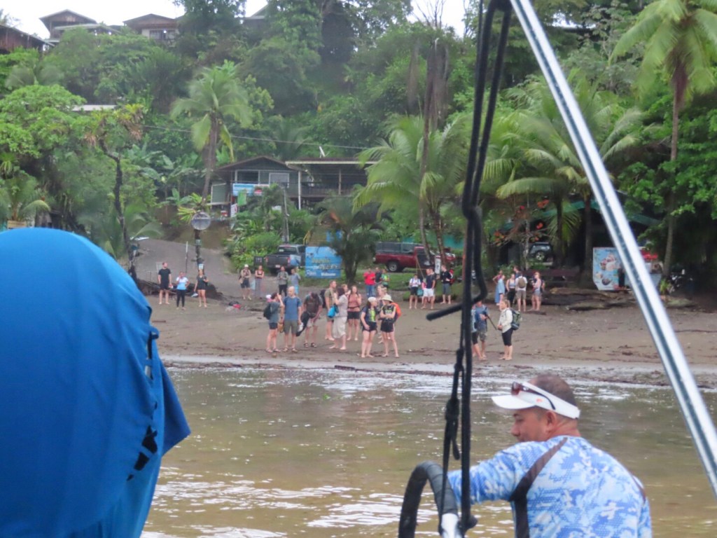 For the past two days we’ve been smirking at the herds of tourists getting prodded onto their cattle boats like so many sheep going off for their daily excursions only to come limping home later in the day. Today it was our turn to become one of the flock and get goaded up the chute onto an overstuffed panga full of Euros heading down to Corcovado National Park. They squeezed 28 of us aboard one of the ubiquitous aqua green boats and throttled it up for the one hour cruise down to the park. The ocean was rough from last night’s deluge of a thunderstorm and the hull slammed repeatedly on the surface every time we crested a swell.