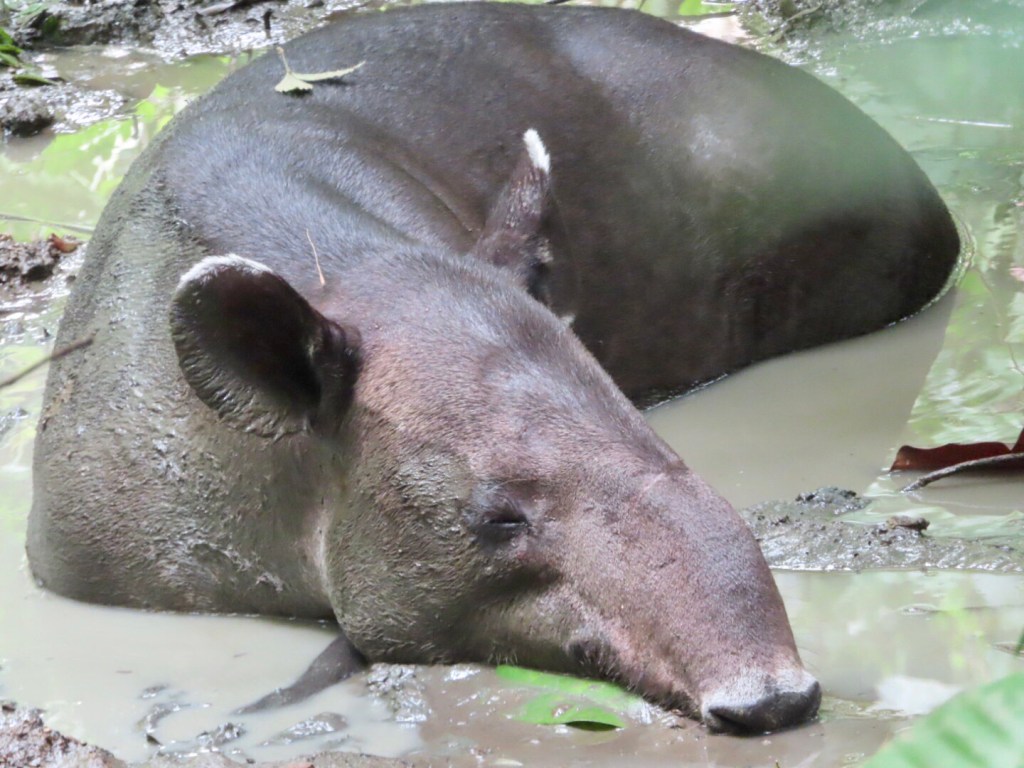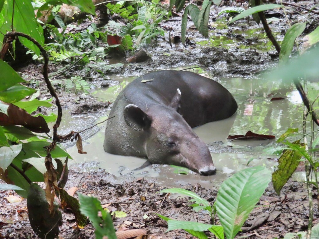 After lunch, it seemed the whole contingent of visitors were marching zombie like in a mass herd racing back to the boats. I was feeling a bit deluded and tourist tacky plodding along with the multitude. That is, until Estefani and another guide slipped off the main trail for a few minutes and came back excited to let us know that we’d found Costa Rica’s largest terrestrial mammal, the danta! We took turns going in to have a peek. Snoozing in a mud hole was an adult tapir resting up for tonight’s foraging. Made my day and put the smile back on my face.