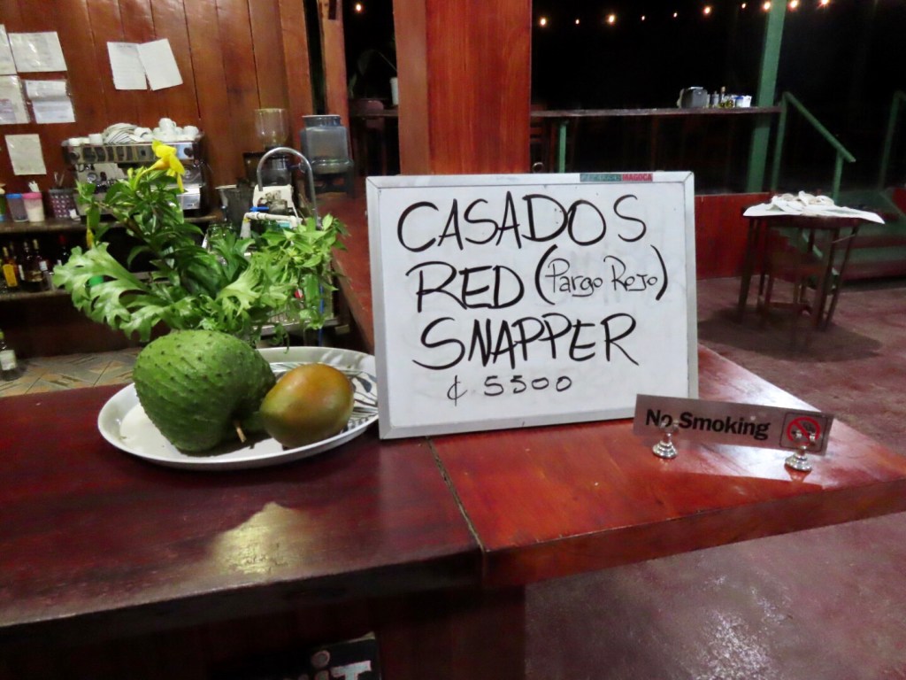 PJ and I jumped off at the dock we boarded at and walked back past the giant stands of bamboo to Jinetes where we climbed the hill and sat out in the gazebo hydrating until we cooled off. It was time for naps and showers until the sun was going down and the heat eased up just slightly. We walked into town to check out the vibe. Mar y Tierra Restaurant had landed a giant snapper today and the owner made a big batch of ceviche. I ordered that with patacones while PJ had a whole fish with veggies and patacones. Best ever. Nondescript restaurant with amazingly prepared fresh fish.