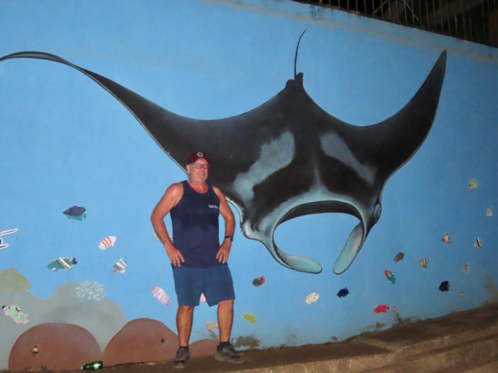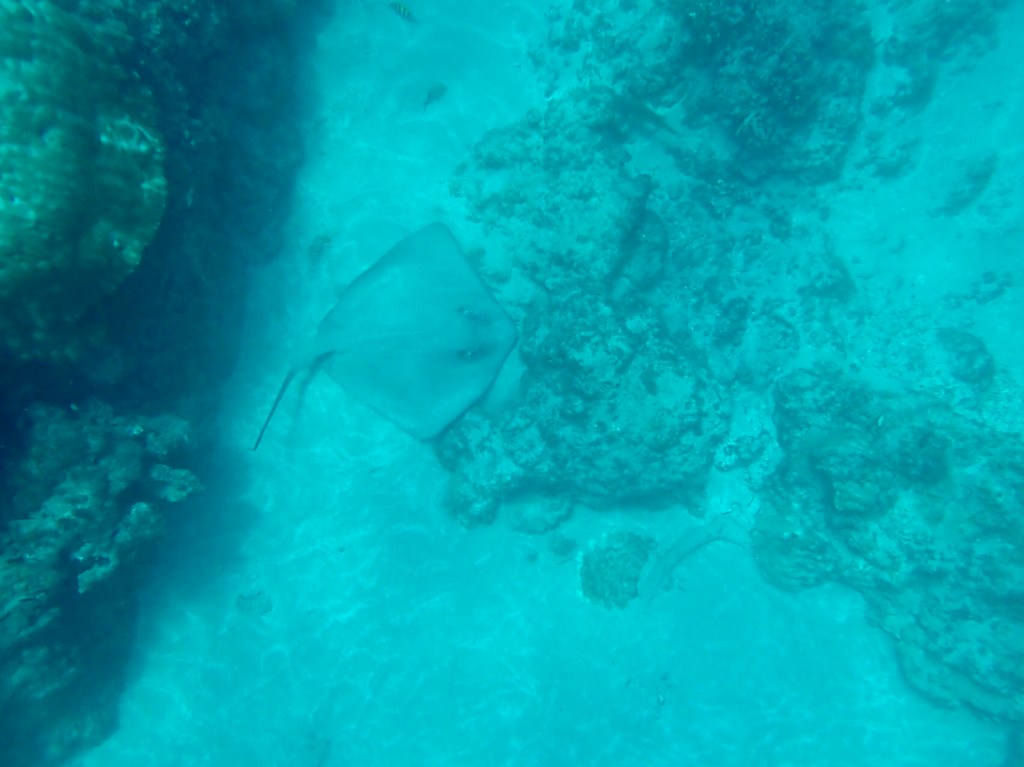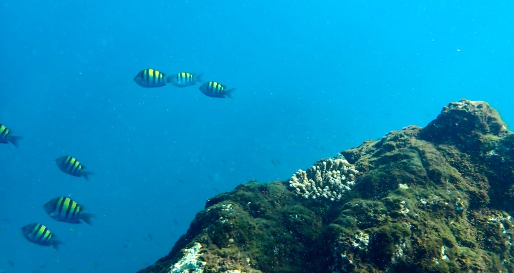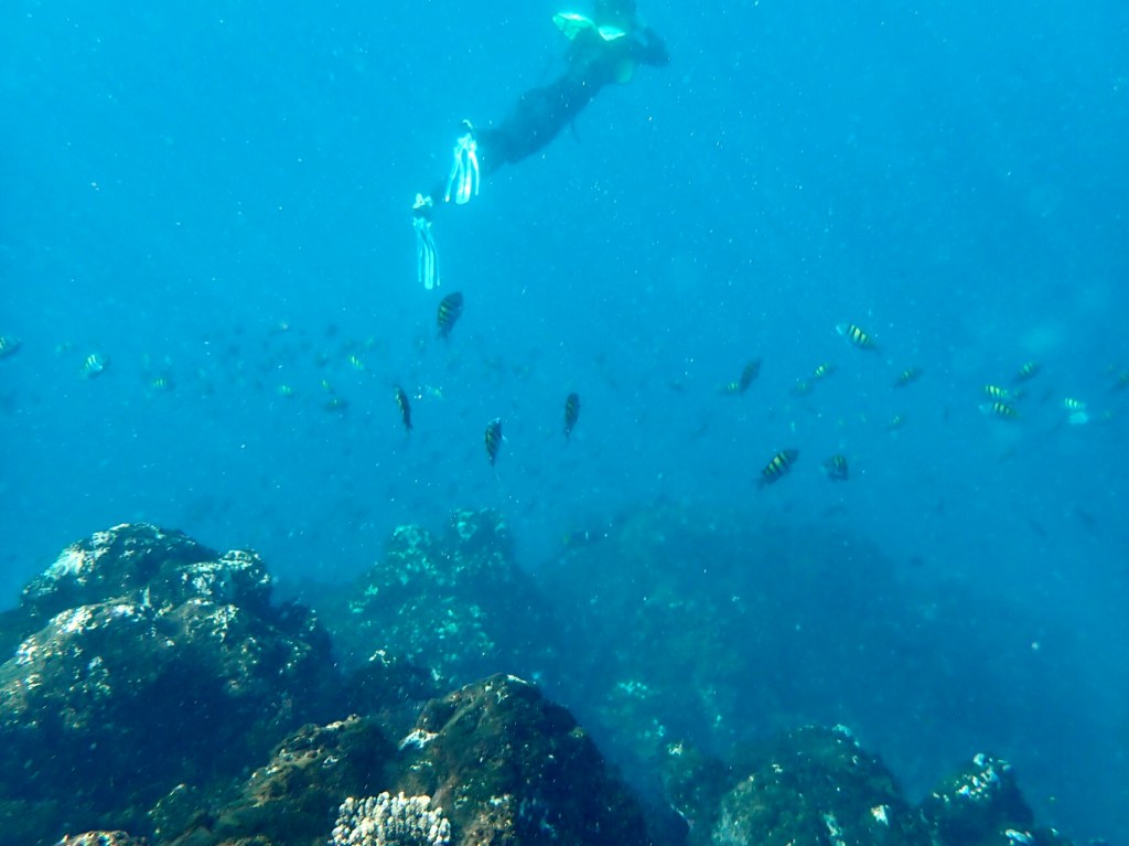 Daniel was our guide and he led us between three pinnacles of coral in about 30 feet of water. Visibility was okay, maybe 30 feet with a little cloudiness. He towed a bright colored noodle behind him so we could spot his whereabouts. Schools of fish swarmed around the rocky, coral topped peaks which reached to around six feet of the surface at the shallowest. No big aha sightings, but lots of cool fish – sergeant majors, moorish idols, parrot fish and more. After about an hour, some of the group were getting played out. But we had to wait for the scuba divers to finish their dive, get back to the boat and undress. We crawled up the back of the boat about an hour and half into the excursion.