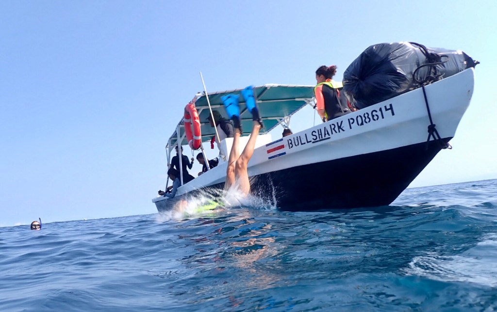 The crew had five scuba divers and seven of us snorkelers. It was clear from the start that the snorkelers were second class citizens just there to fill empty seats and earn some extra cash. The boat roared out to the island over much calmer waters than yesterday and the sun was even smiling upon us from a sky with just a small scattering of clouds. The anchor was dropped off the north side of Isla Cano and us snorkelers were directed to the bow where we geared up. I asked the scuba gal for a weight belt and she about bit my head off. I skulked back up to my place at the bow and we splashed into the warm tropical sea.