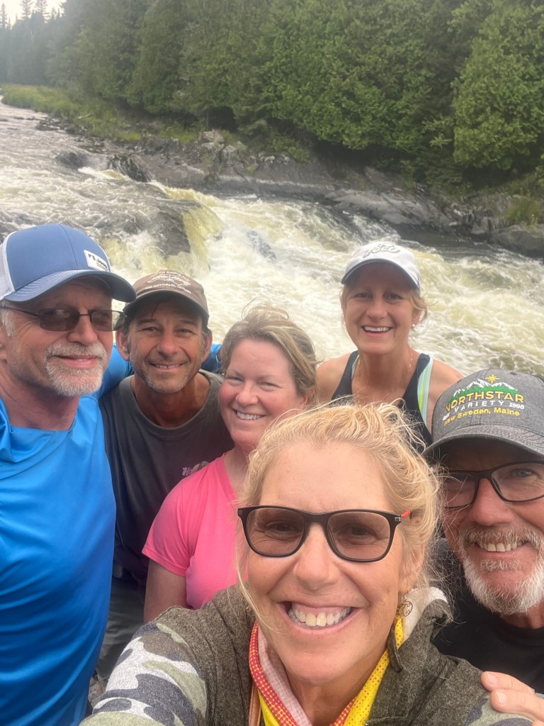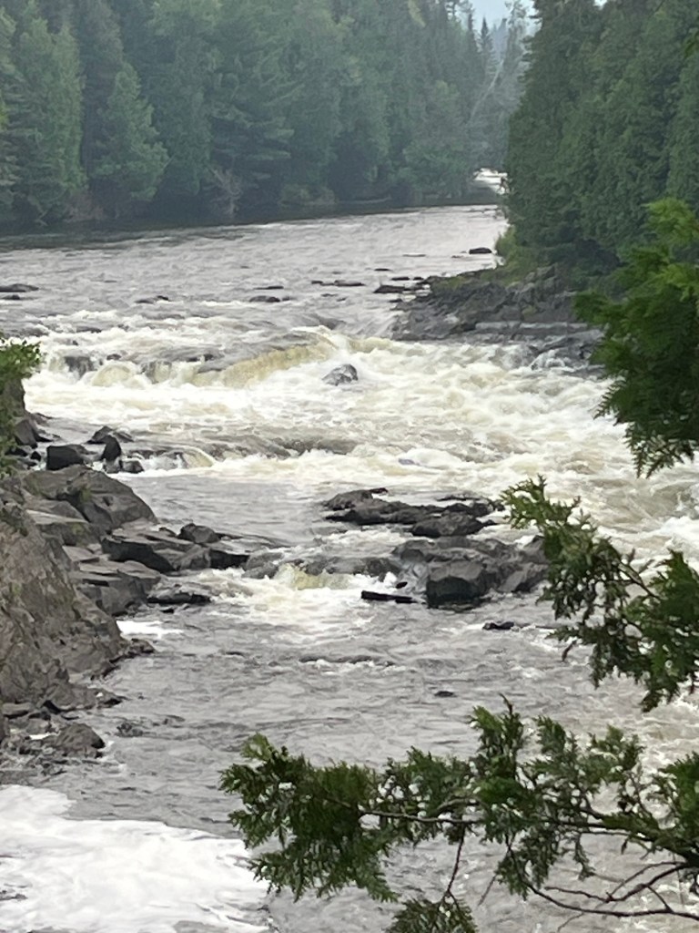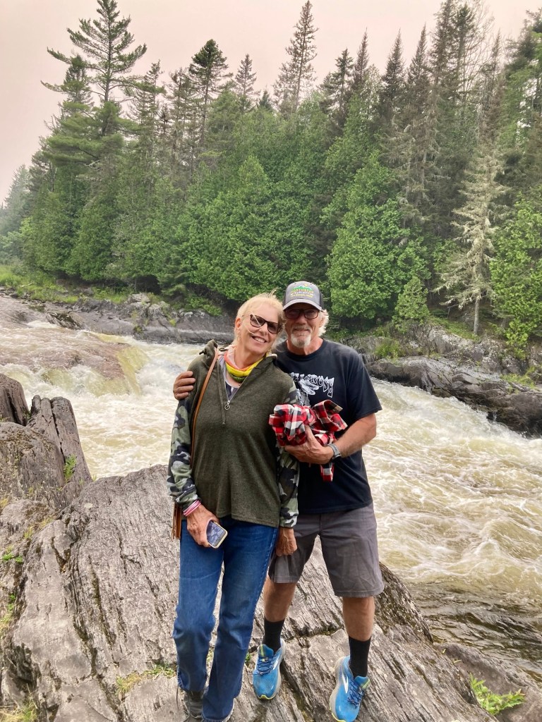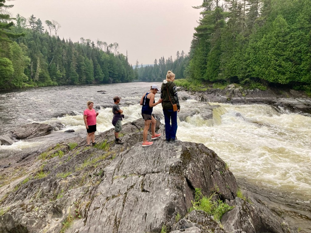 Washed the RV and prepared everything for an escape. It was down to us two, Lance and Laura, Dianne and Doug, the prodigal cousin from Tennessee. We piled into the van and Laura drove us towards Eagle Lake where we headed over to Fish Tail falls. The six of us crossed the landing strip of the local airport then hiked through the forest up to the rushing water. A beautiful day for a hike. Cool and overcast. A bit smoggy really, from large fires burning up across the border. Can’t trust those Canadians.