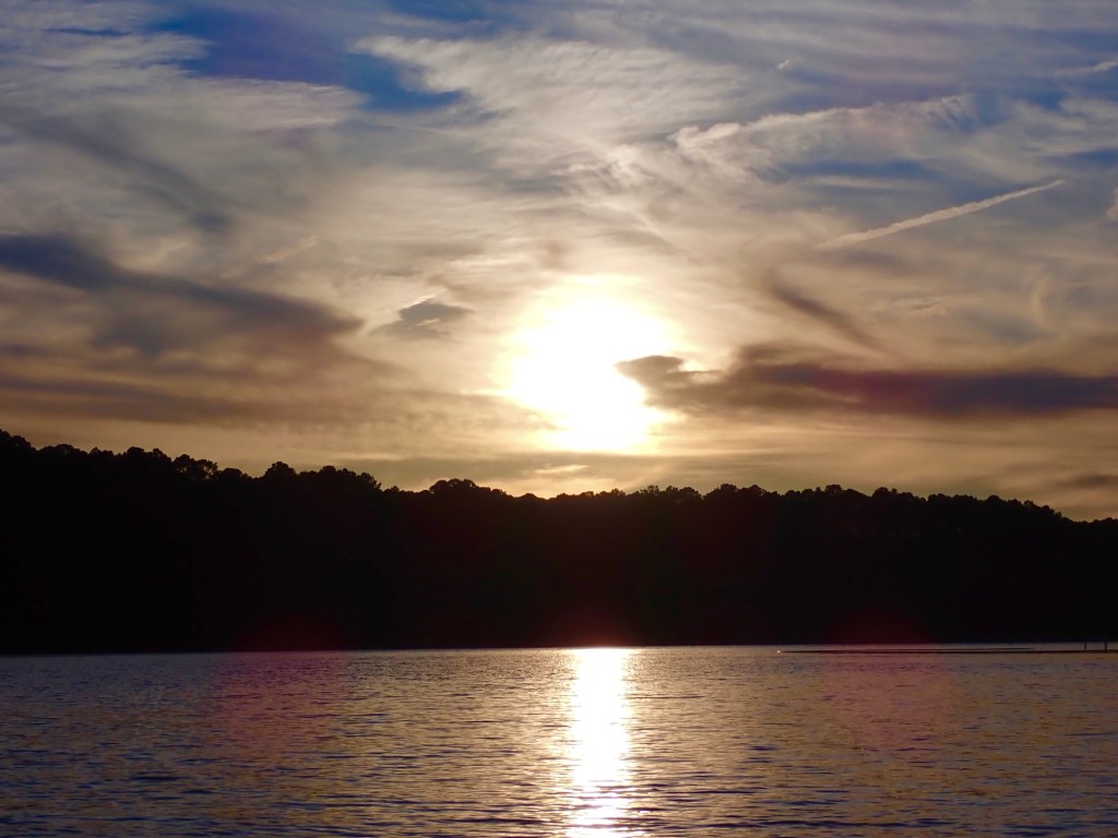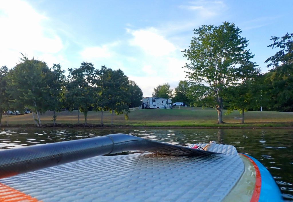 Got myself set up, connected and unpacked then took a paddle up the left hand shore of Pin Oak lake. A slight wind was ruffling the water. I went hard against the wind then coasted home to be greeted by a beautiful sunset.