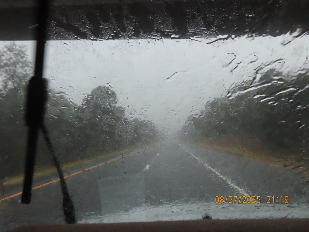 Small axe, isn’t that a Bob Marley tune? The rain started coming down hard throughout the night. Not realizing the storm was coming so soon, the mats and bike cover were left out and soaked. Around 8:30 there was a little break so I dried them as best I could with the leaf blower before stashing everything away and driving off into the maelstrom.