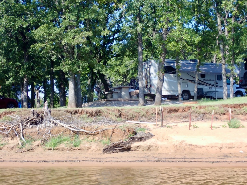 In the late afternoon, I pulled into Little Axe camping area on the shore of Thunderbird Lake. I backed into the lantern post and left it bent at about a 30 degree angle. After setting things up, I heard the lake calling my name. Needed to get wet to wash myself awake.