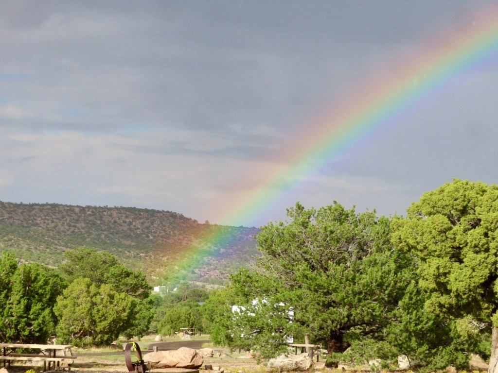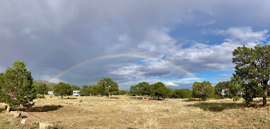 It began drizzling so I moved on and rode a short distance into the little community of Bluewater. A magnificent rainbow greeted me on the way out of the park.