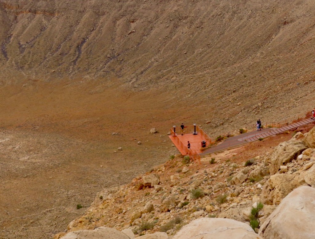 Lots of wind and a few good inclines and I was chaining the bike at the ticket booth. Due to danger of lightning, the guided rim tours were postponed. But I walked out on the viewing platforms and got an amazing eyeful of outer space impact. Walked around checking it out from different angles. 50,000 years ago this chunk off an asteroid came barreling in at 26,000 miles an hour and blew this massive indentation in the Arizona desert. Or was it a desert back then? This is the best preserved example and most studied meteor crater in the world.