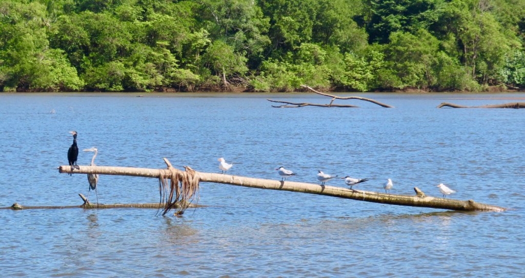He began our voyage moving towards the estuary to float through the mangroves and see what animals might be out and about. Crocodiles everywhere. A heron for every occasion: night, great blue, baby blues, tigers, crested kinds.