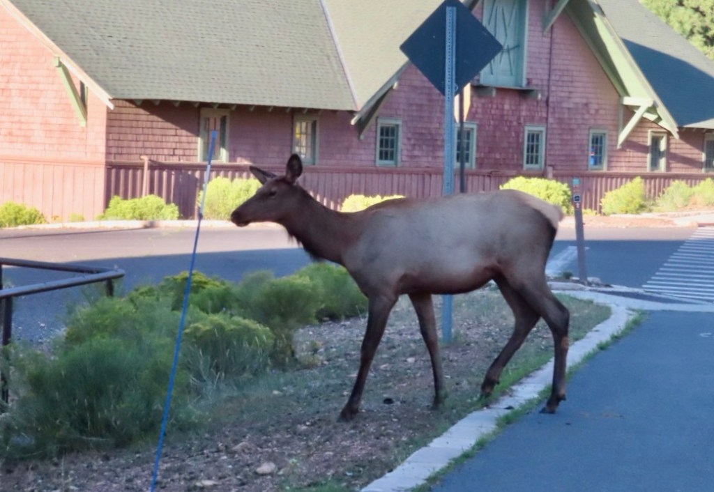 Since I was now in an area with access to dining options other than my usual sandwiches and salads, I decided to treat myself and have lunch at the Yavapai Lodge. Rode the bike over and ate a so so overpriced burger at the tavern. Right outside the window was the greenway that leads to the road out to Hermit’s Rest.